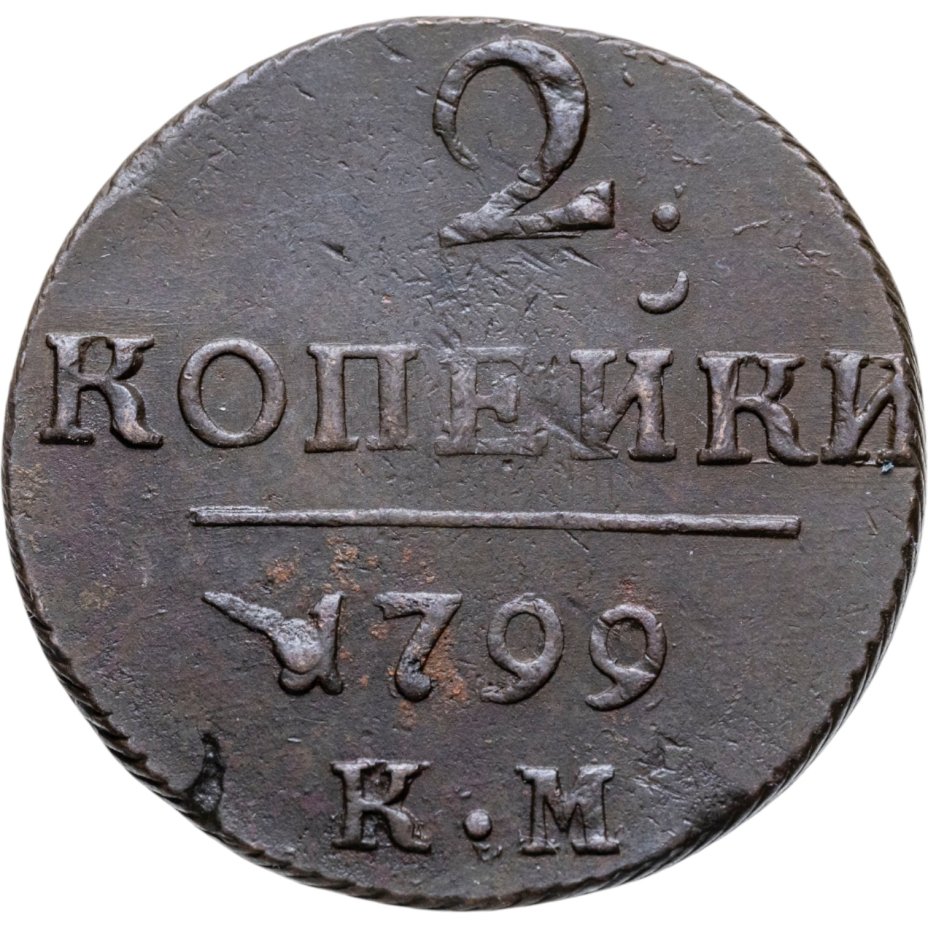 В центре надпись — слово «КОПЕЙКИ». Над надписью — цифра «2.». Под надписью — прямая черта, под ней — дата выпуска монеты «1799». Под датой обозначение Сузунского монетного двора — буквы «К.М».