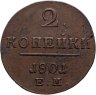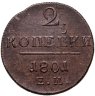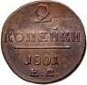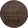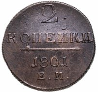 В центре надпись — слово «КОПЕЙКИ». Над надписью — цифра «2.». Под надписью — прямая черта, под ней — дата выпуска монеты «1801». Под датой обозначение Екатеринбургского монетного двора — буквы «Е.М.».