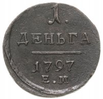 В центре надпись — слово «ДЕНЬГА». Над надписью — цифра «1.». Под надписью — прямая черта, под ней — дата выпуска монеты «1797». Под датой обозначение Екатеринбургского монетного двора — буквы "Е.М.".