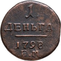 В центре надпись — слово «ДЕНЬГА». Над надписью — цифра «1.». Под надписью — прямая черта, под ней — дата выпуска монеты «1798». Под датой обозначение Екатеринбургского монетного двора — буквы "Е.М.".