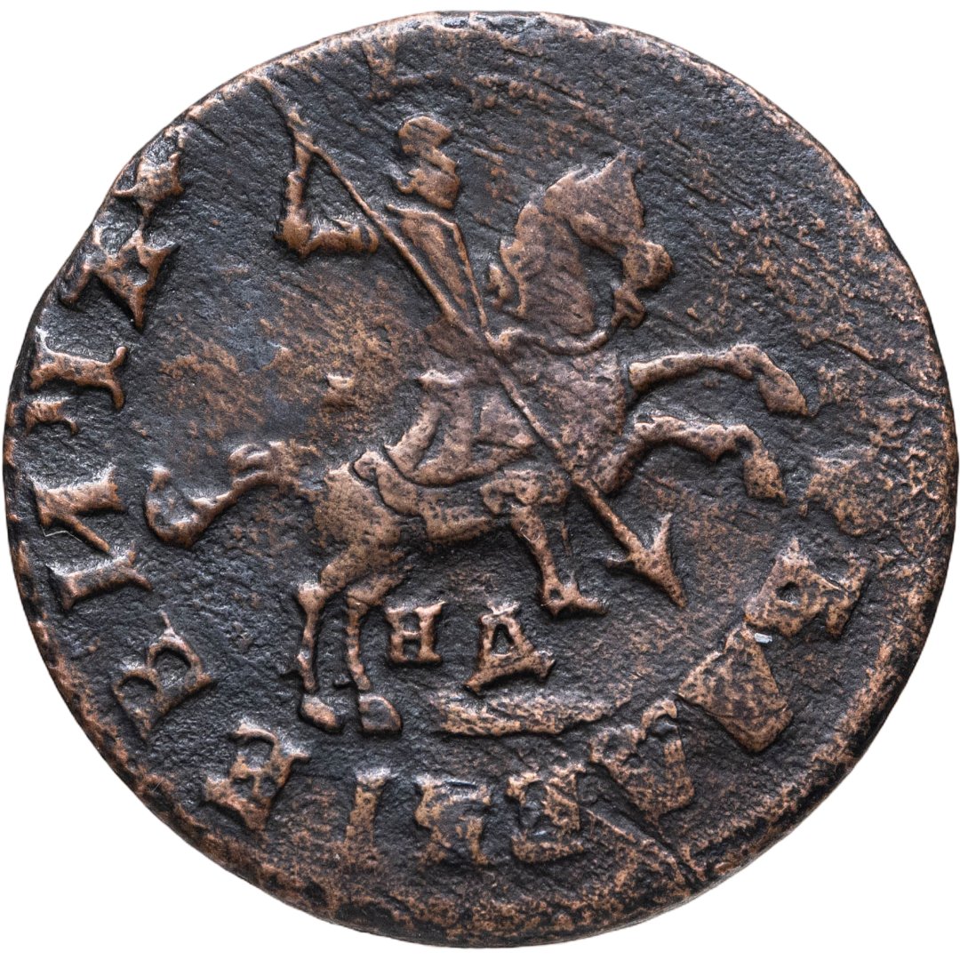 В центре изображение Георгия Победоносца, поражающего копьём дракона. Над головой всадника - цветочная розетка. Под всадником - буквы «НД». Обозначение Набережного монетного двора. Вокруг центрального изображения круговая надпись: «ЦРЬ ПЕТРЪ АЛЕЗIЕВИЧЪ».
