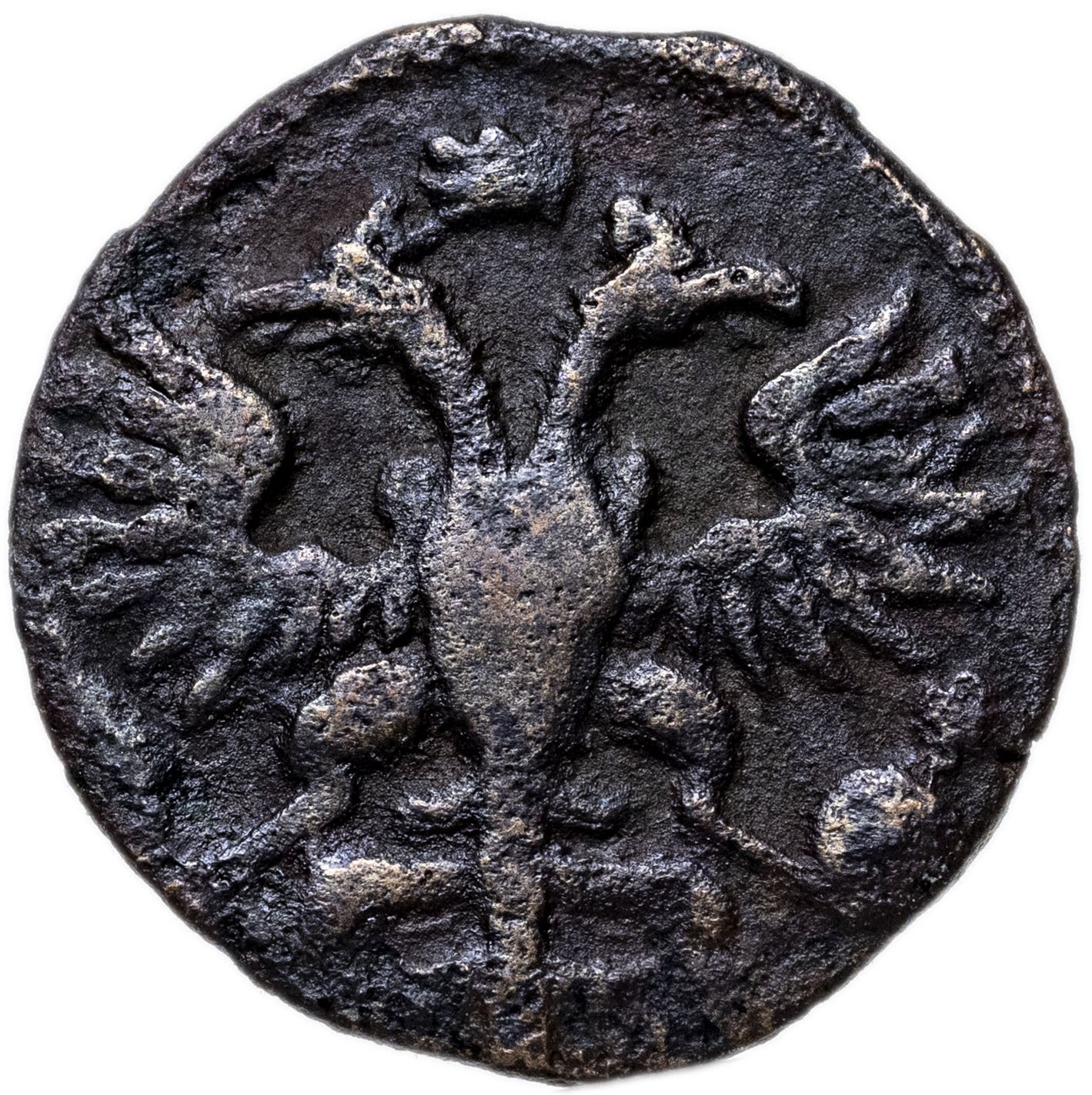 В центре указан номинал в две строки: «ПОЛУ»│«ШКА». Под номиналом указан год выпуска - «1722». Над номиналом надпись: «ВРП». По окружности канта - витой точечный ободок.