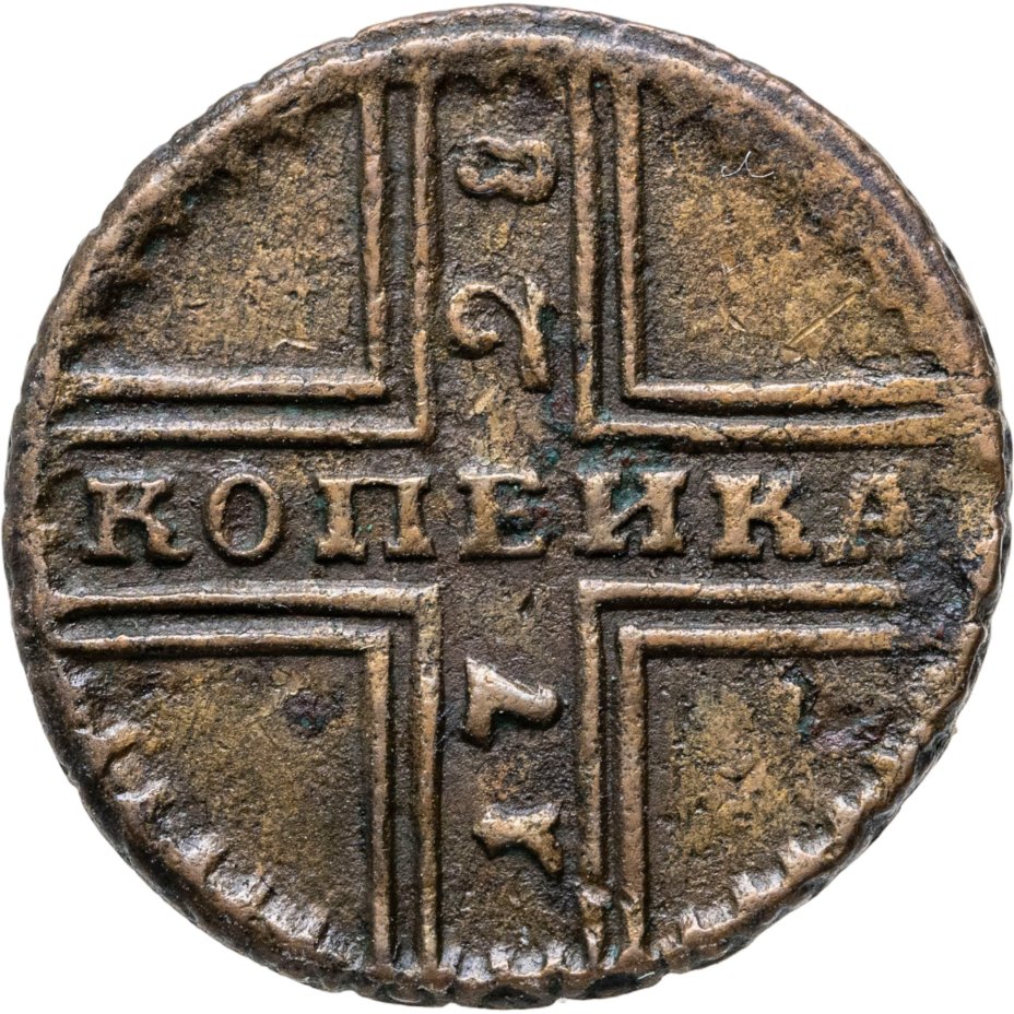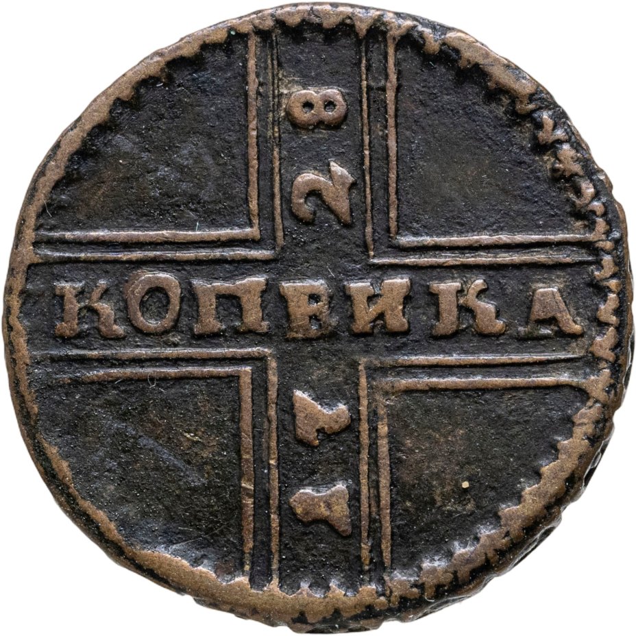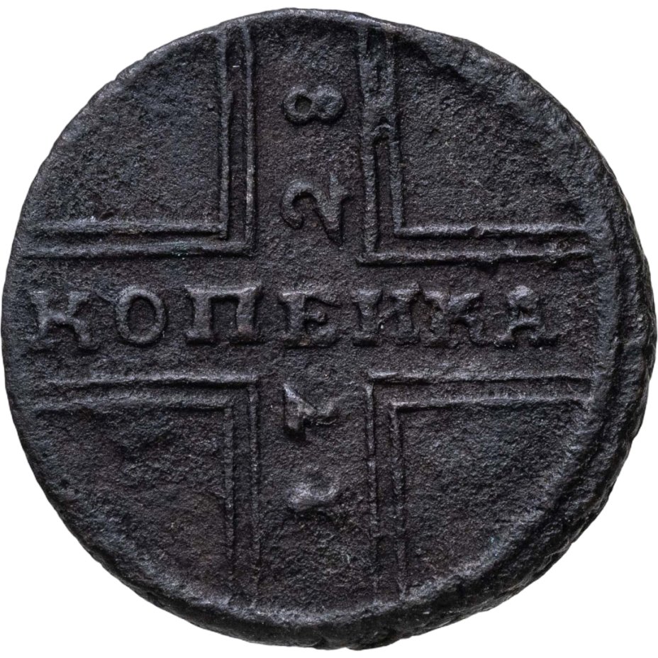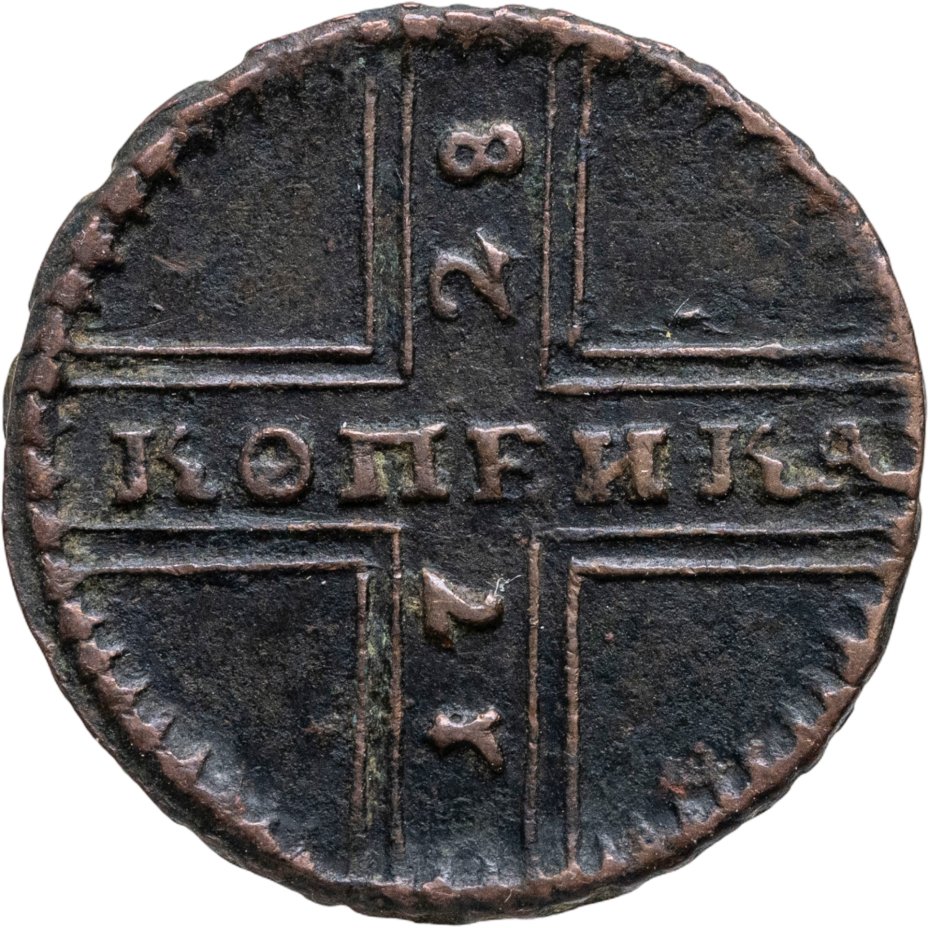 На реверсе монеты двойной линией прорисован равносторонний крест. Внутри одной перекладины креста указан номинал – «КОПЕИКА», внутри другой дата чеканки, разделённая на две части указанием номинала – «17 28». Нормативный вес – 4,1 г, диаметр – 20 мм.