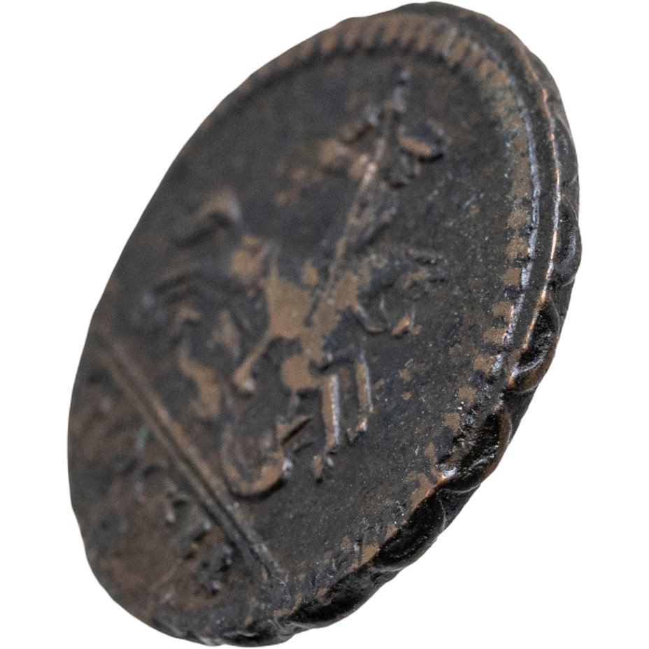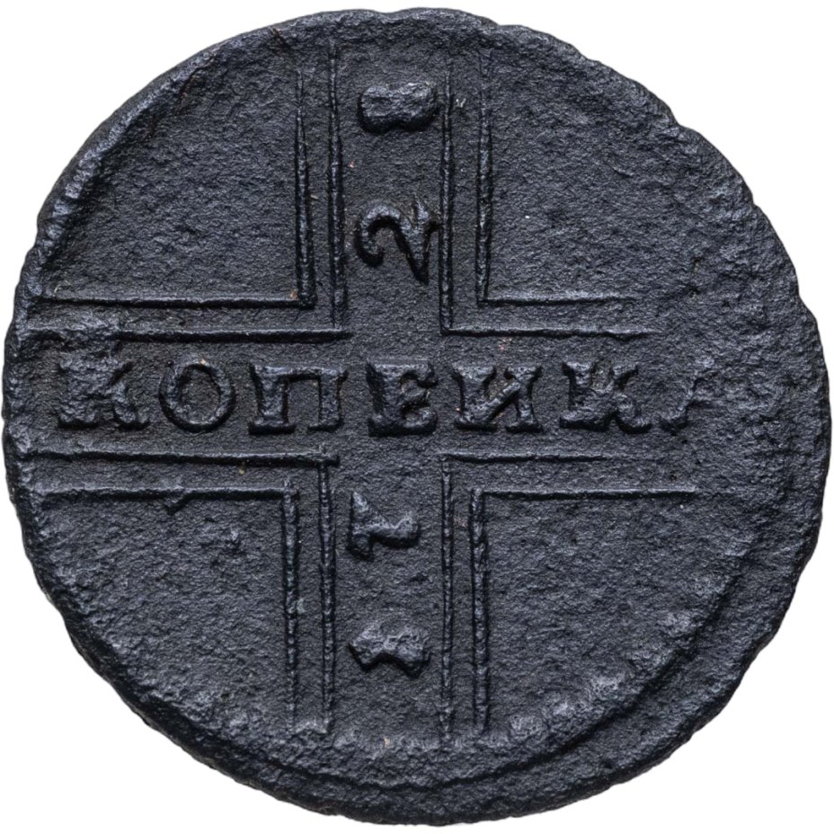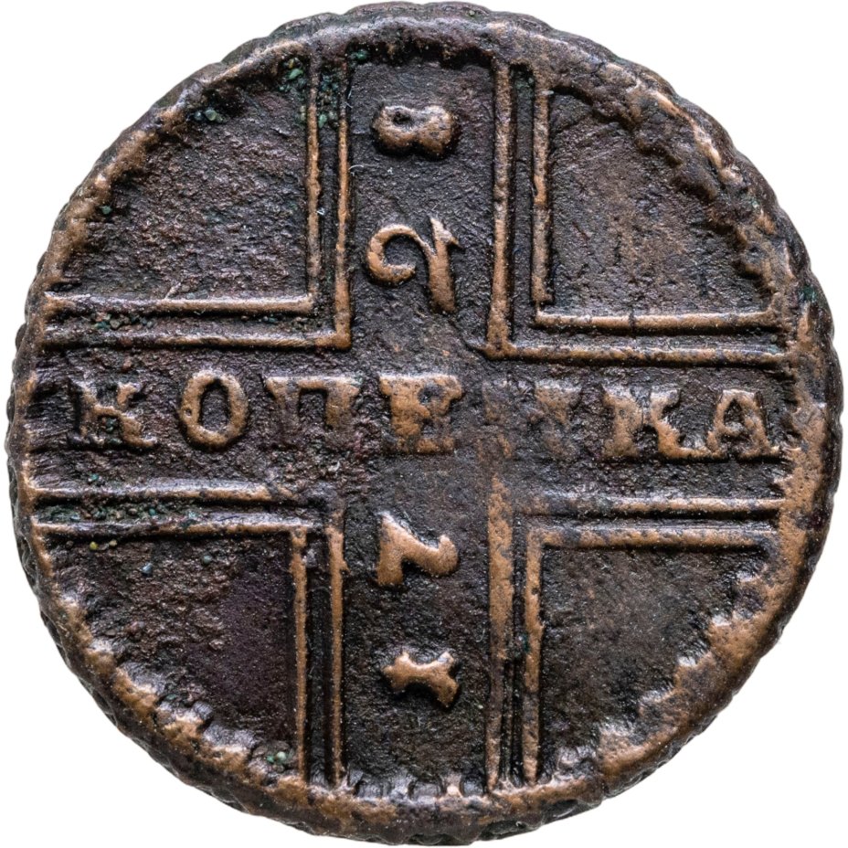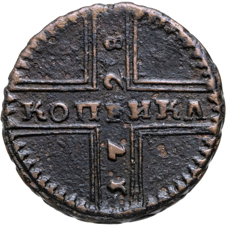 На реверсе монеты двойной линией прорисован равносторонний крест. Внутри одной перекладины креста указан номинал – «КОПЕИКА», внутри другой дата чеканки, разделённая на две части указанием номинала – «17 28». Нормативный вес – 4,1 г, диаметр – 20 мм.
