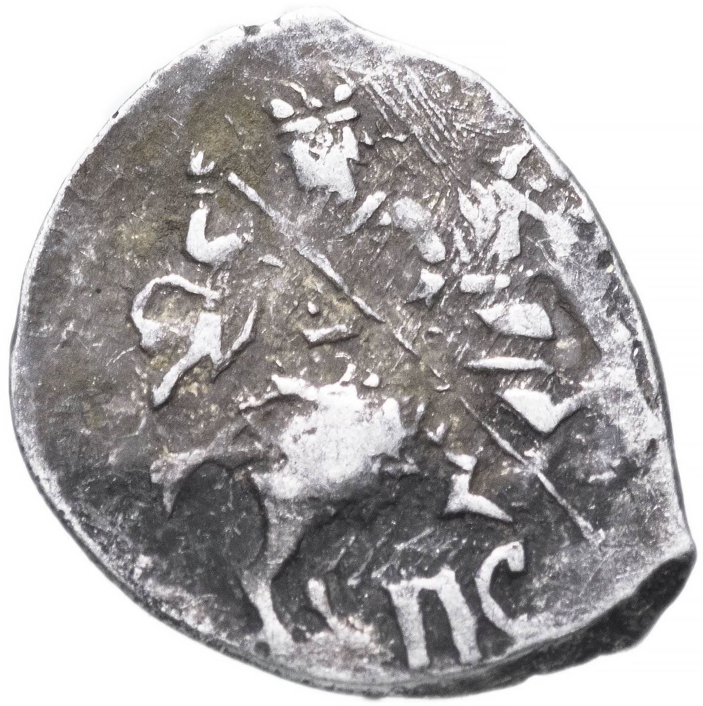 ЛИЦЕВАЯ СТОРОНА: Царь в трехчастном венце на коне направо, держит опущенное копье. За спиной развевается плащ. Под конем буквы ПС.