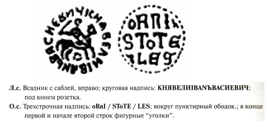 Новгородские монеты представляют собой единообразную группу: всадник с саблей в окружении надписи, обозначающей титул и имя русского правителя, а с обратной стороны — «Господарь всея Руси».