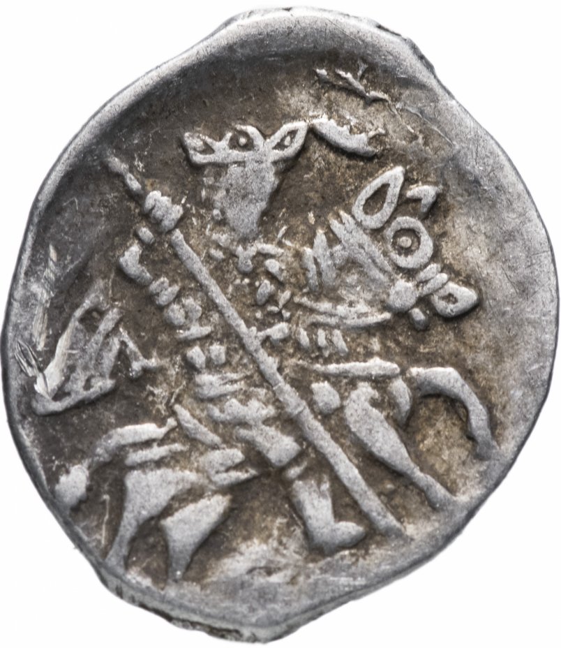 ЛИЦЕВАЯ СТОРОНА: Царь в трехчастном венце на коне направо, держит опущенное копье. Под конем буквы ГР.