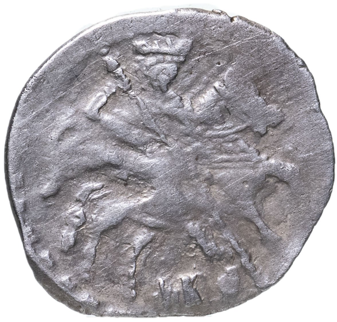 ЛИЦЕВАЯ СТОРОНА :Царь в трехчастном венце на коне направо, держит опущенное копье. Под конем буквы IBЯ.