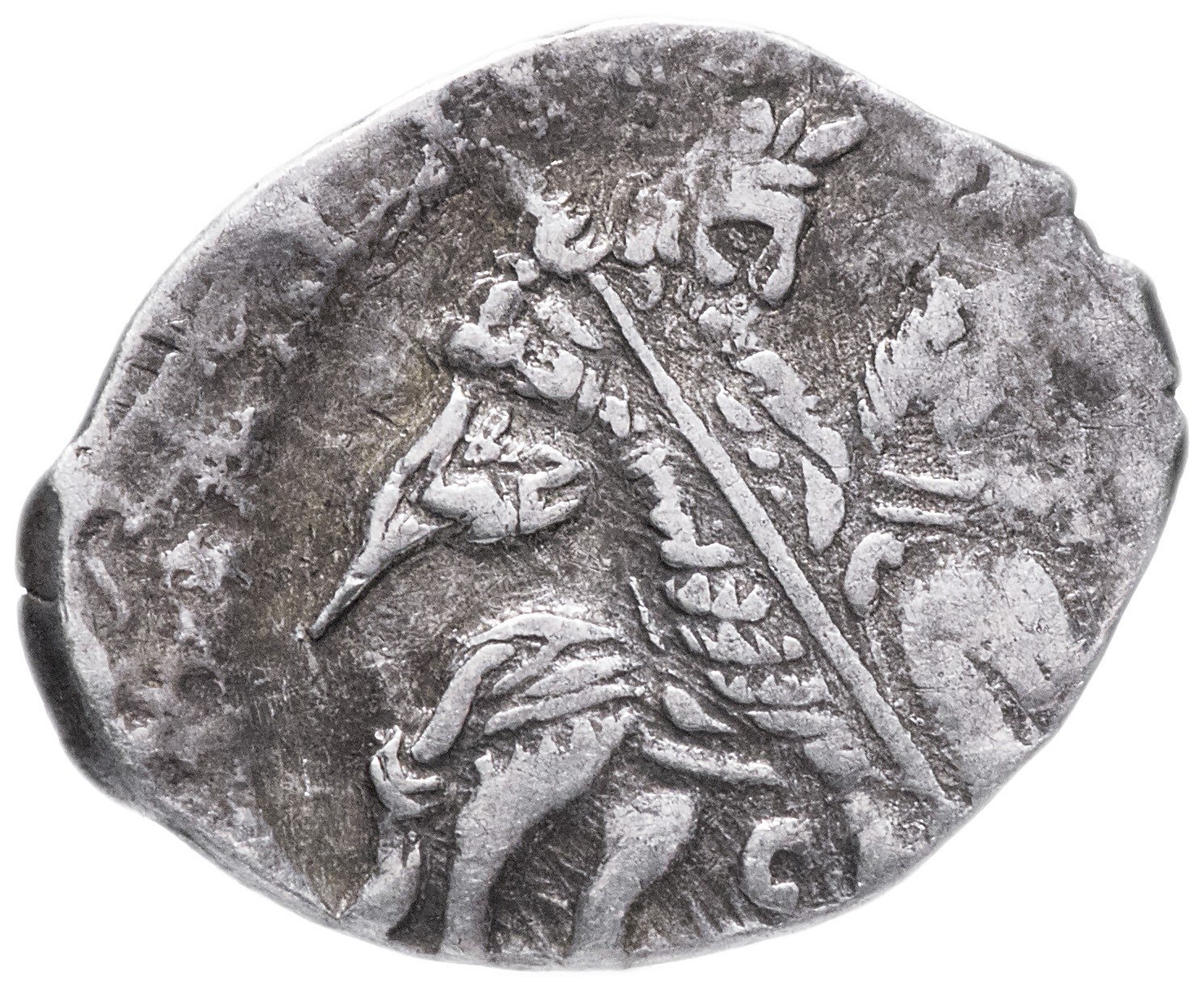 ЛИЦЕВАЯ СТОРОНА : Всадник на коне в трехлучевой короне направо держит опущенное копье. Позади развивается плащ. Под всадником буквы с/МН