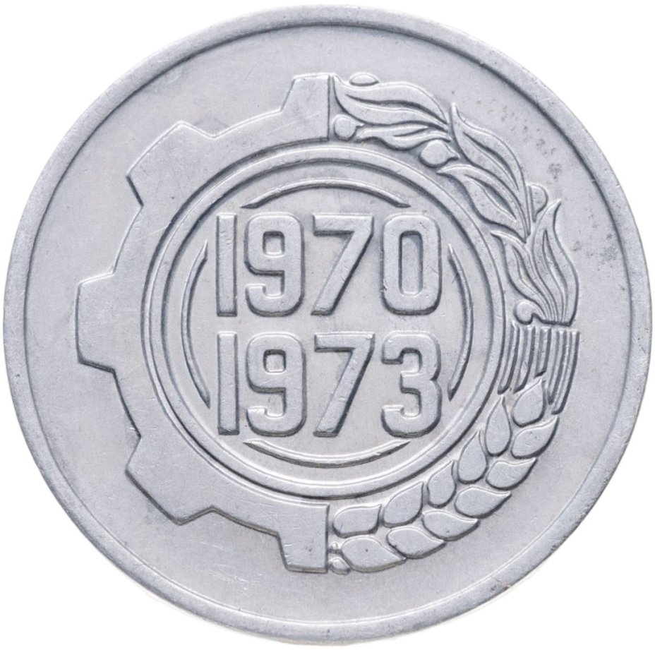 Первый выпуск образца 1964 года был однотипным и содержал государственный герб на лицевой стороне, а на обратной - цифровой номинал по-арабски и год чеканки по европейскому и мусульманскому календарям. В 1971-73 годах был изменен дизайн 50 сантимов: на аверсе были изображены символы знаний - циркуль, книга и колба на фоне солнечных лучей. В 1989 году были отчеканены последние алжирские разменные сантимы. Алжирские монеты этого типа будут интересны и коллекционерам монет ФАО, под монетарную программу которой страна попадала неоднократно.