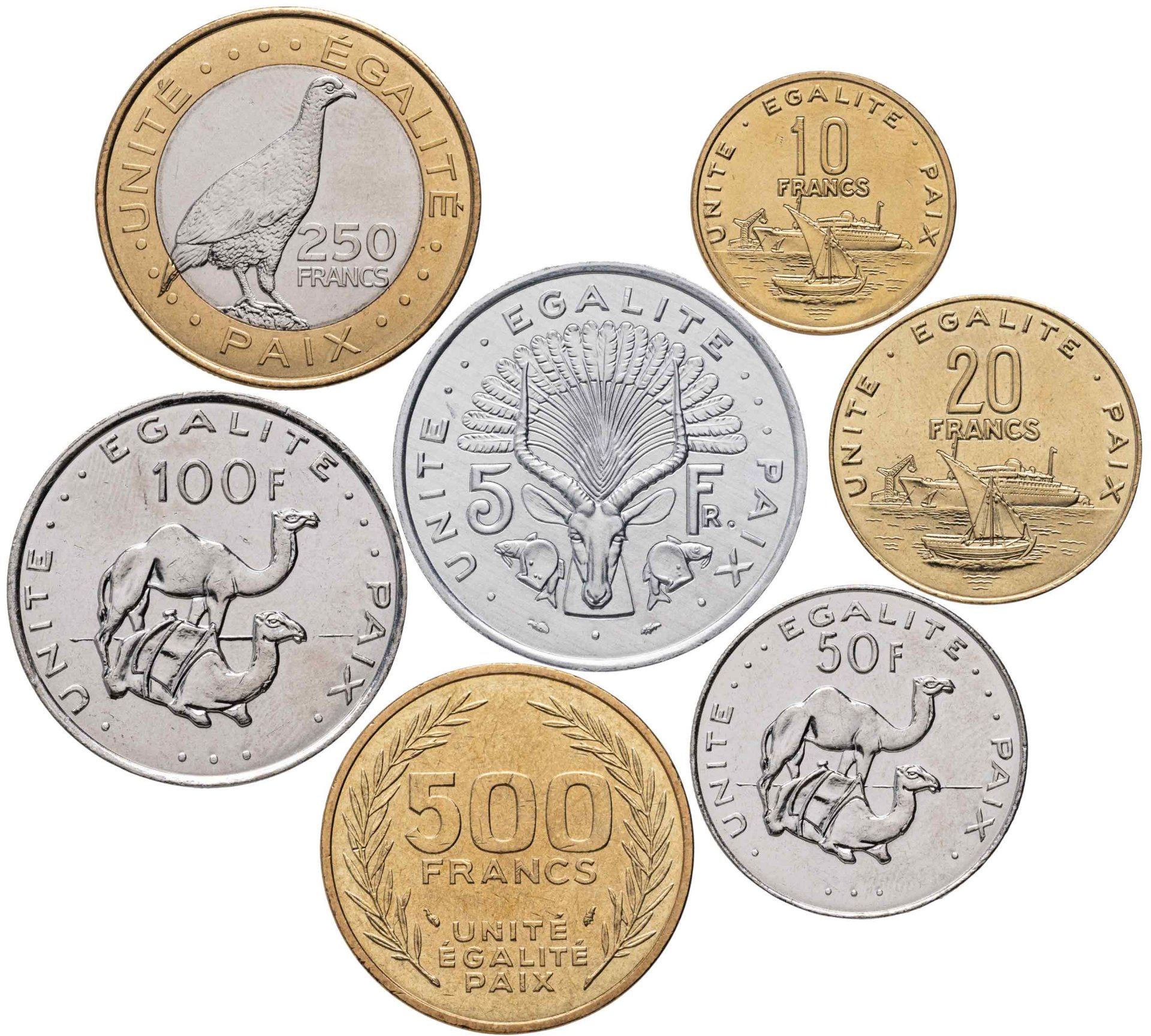 Номиналы 5, 10, 20, 50, 100, 250 и 500 франков