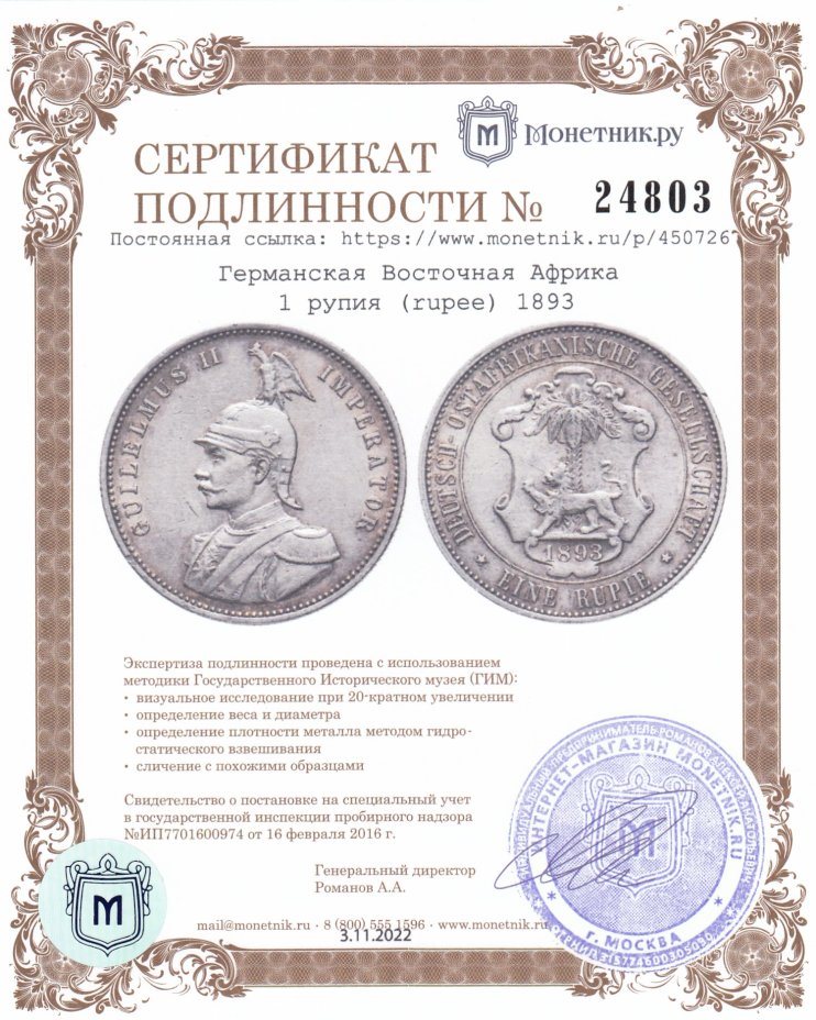 Германская Восточная Африка 1 рупия (rupee) 1893