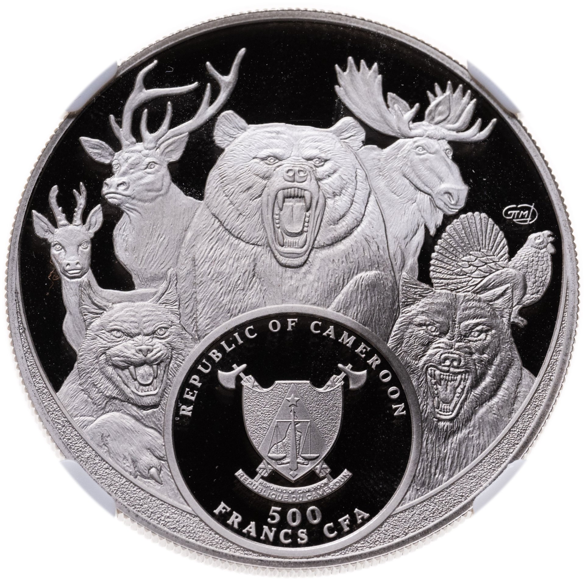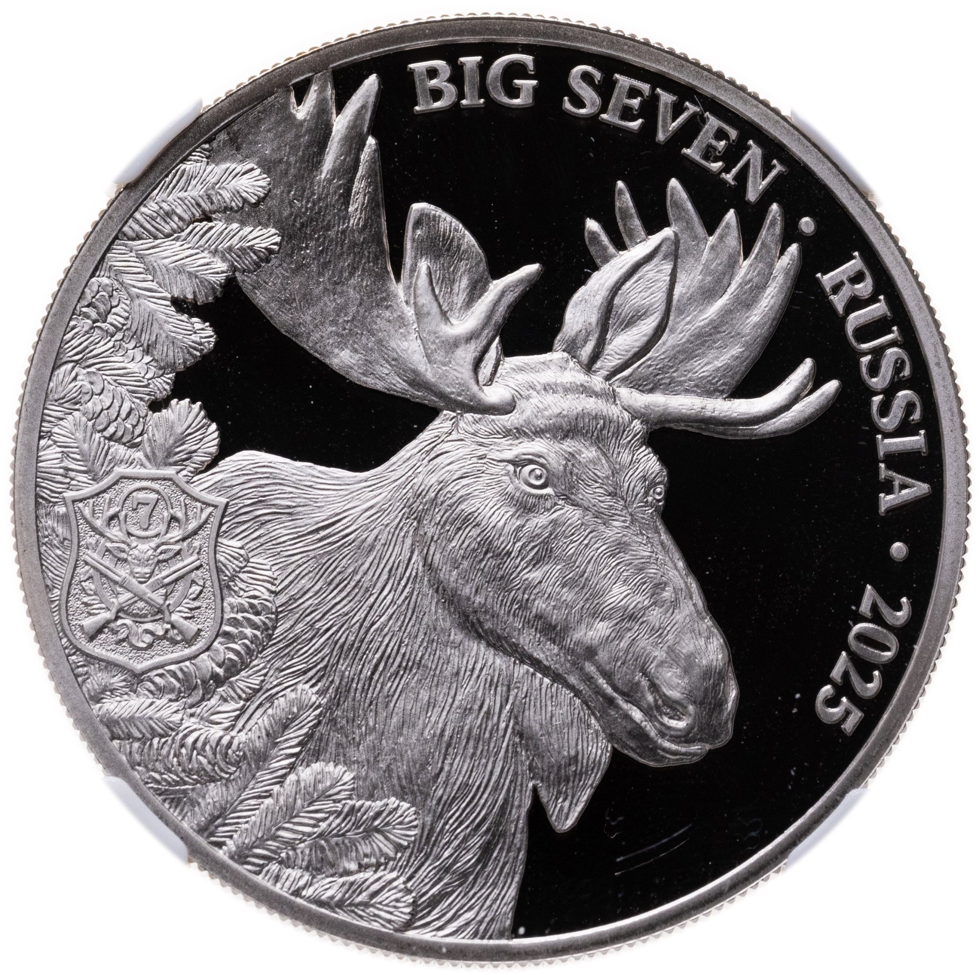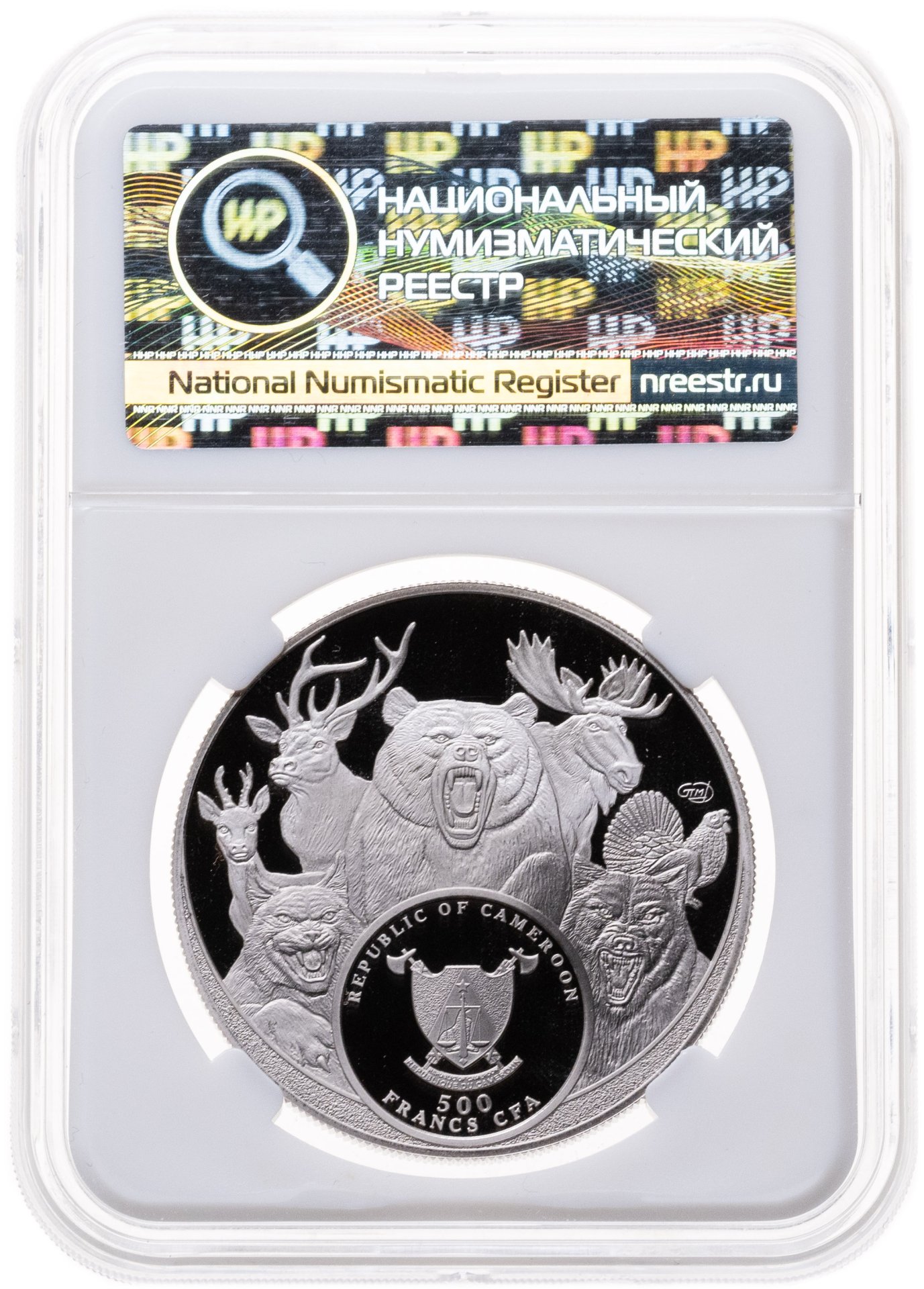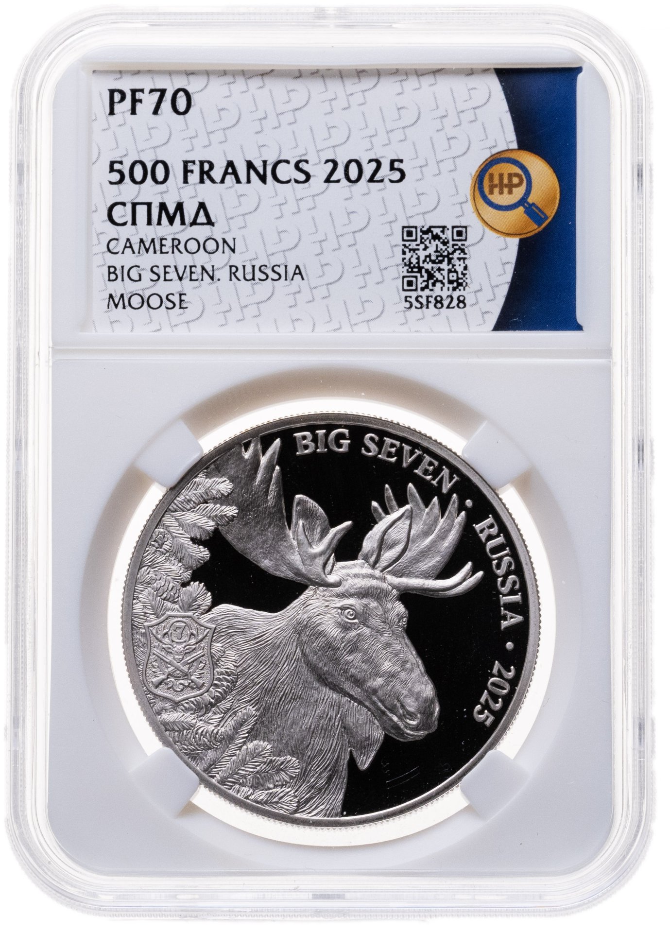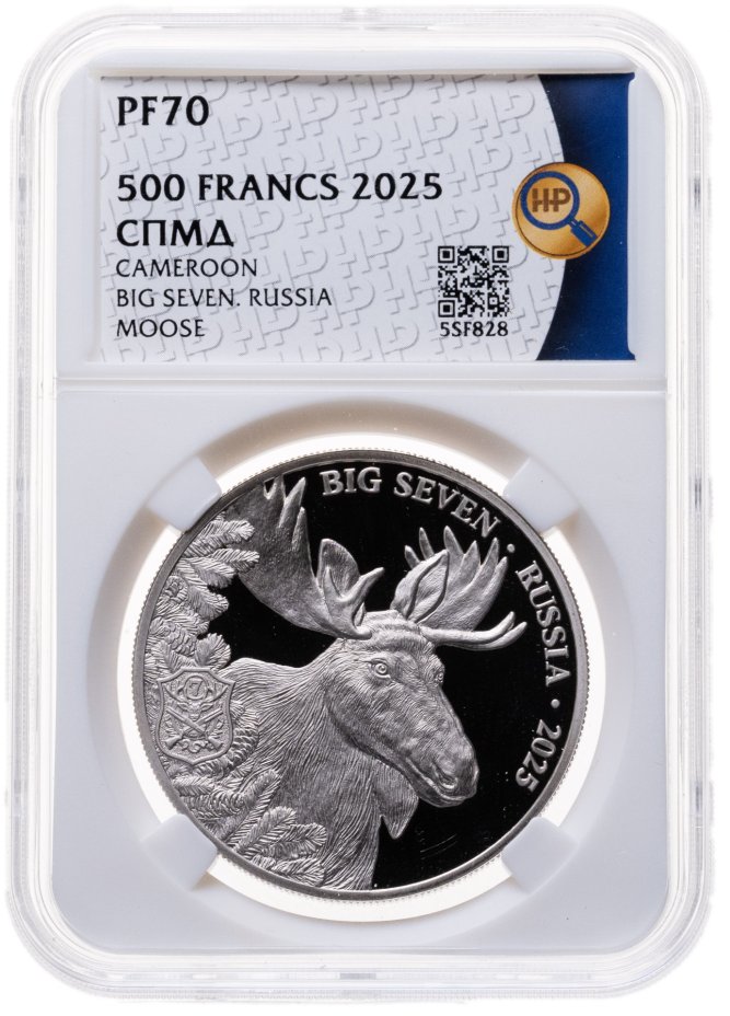 Лось. Животные. Охота. Трофеи охотников. 500 франков CFA 2025 СПМД Камерун. Чеканка Санкт-Петербургского монетного двора в серии «Большая семерка России» (BIG SEVEN RUSSIA), которая посвящена наиболее почетным трофеям охотников: медведь, марал, лось, рысь, волк, глухарь, косуля. Тираж: 1,000 шт. В слабе ННР PROOF 70.
