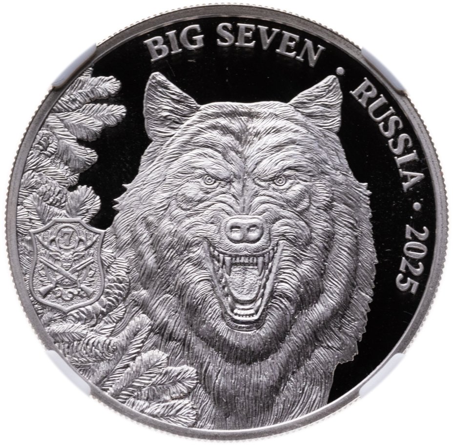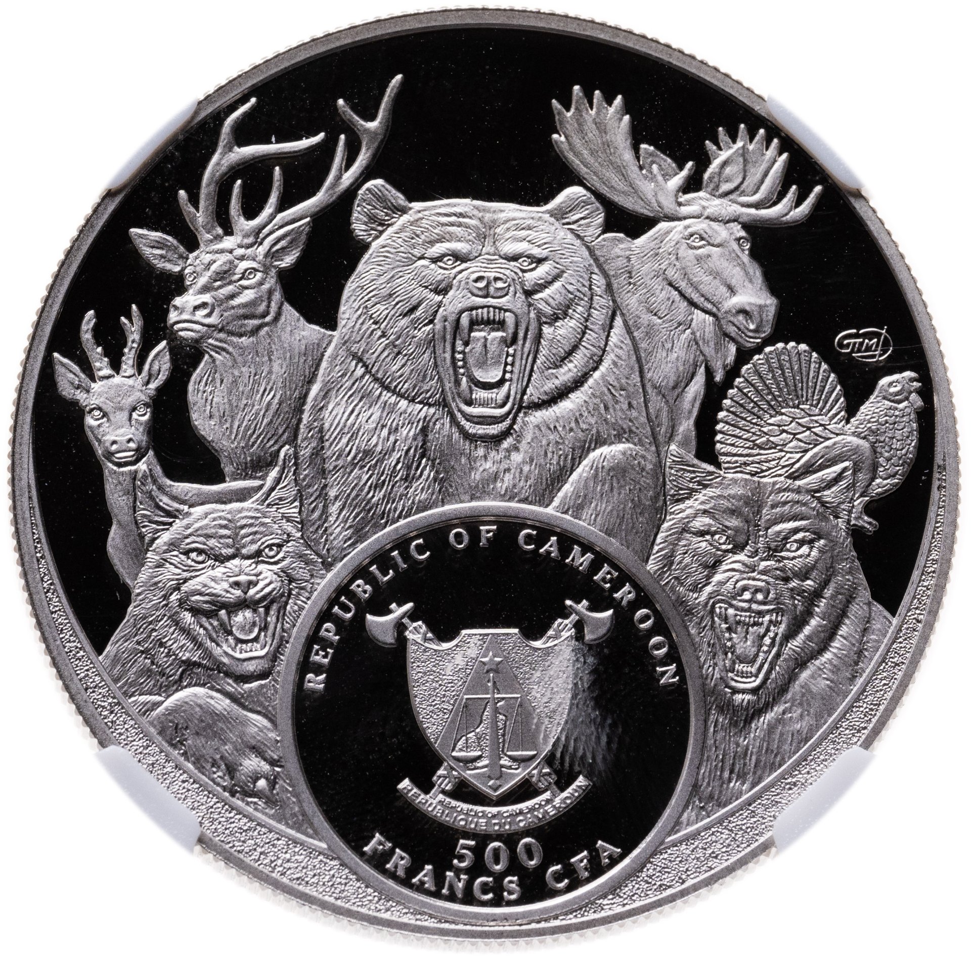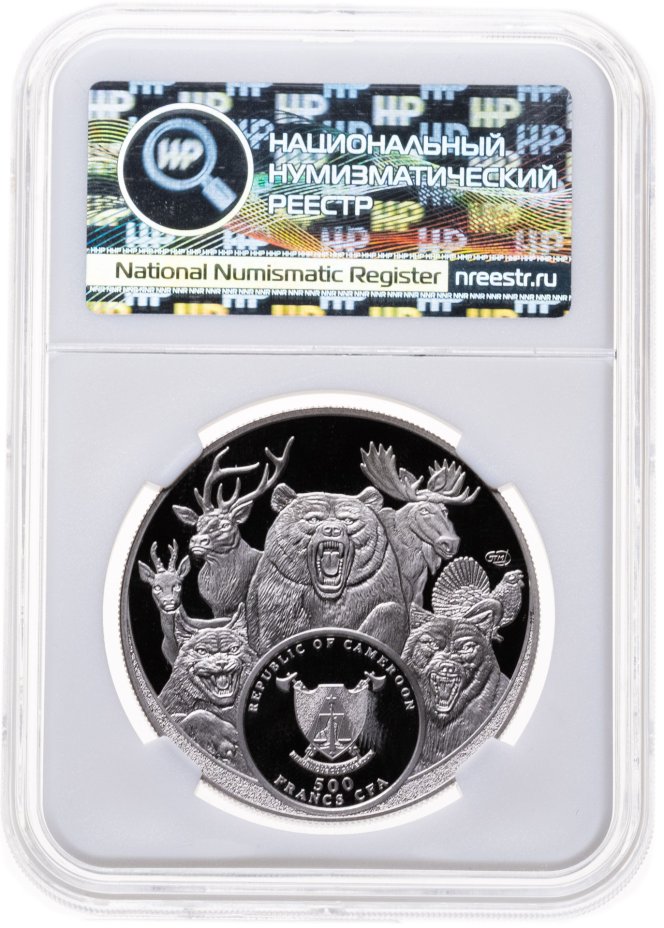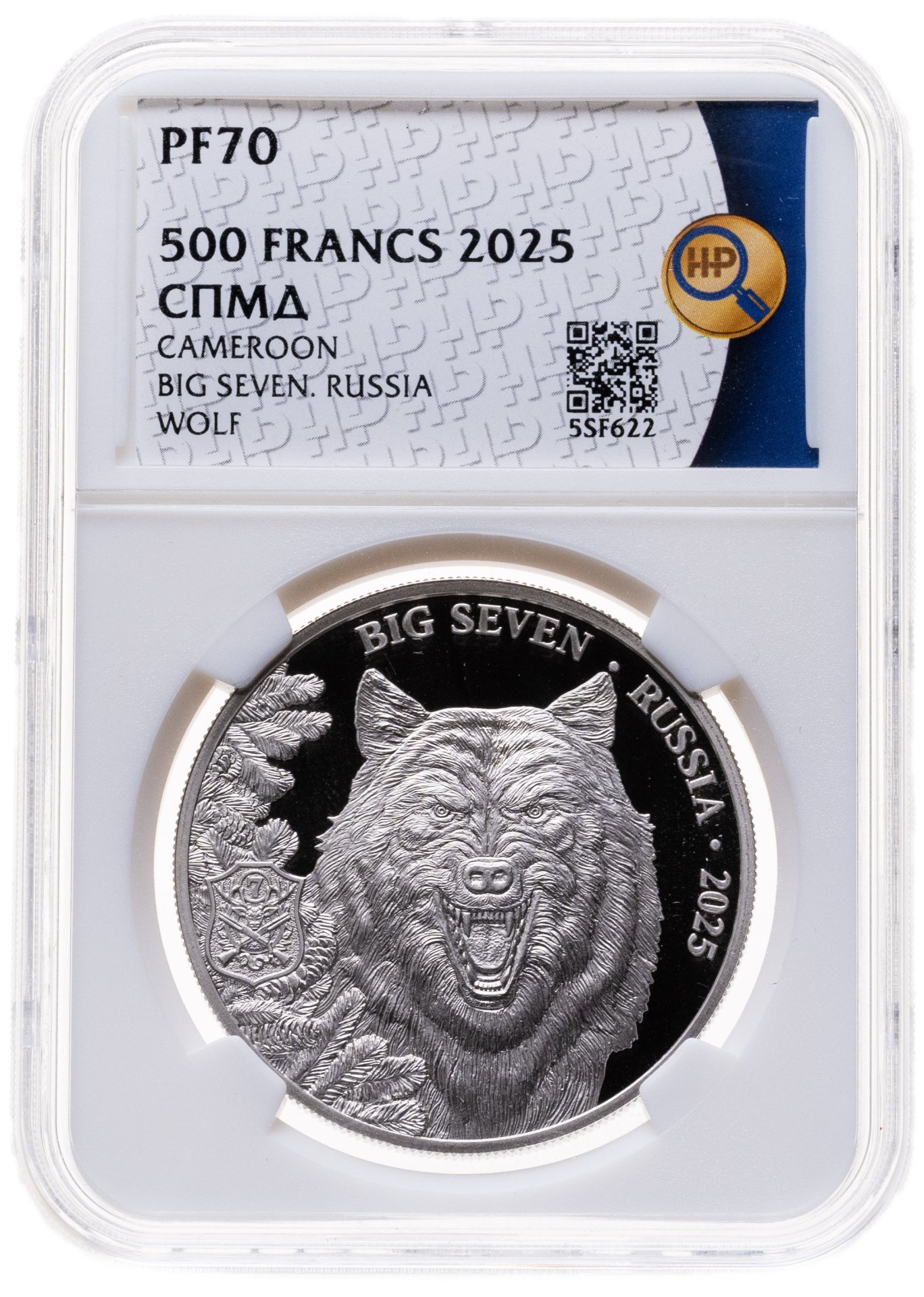 Волк. Животные. Охота. Трофеи охотников. 500 франков CFA 2025 СПМД Камерун. Чеканка Санкт-Петербургского монетного двора в серии «Большая семерка России» (BIG SEVEN RUSSIA), которая посвящена наиболее почетным трофеям охотников: медведь, марал, лось, рысь, волк, глухарь, косуля. Тираж: 1,000 шт. В слабе ННР PROOF 70.