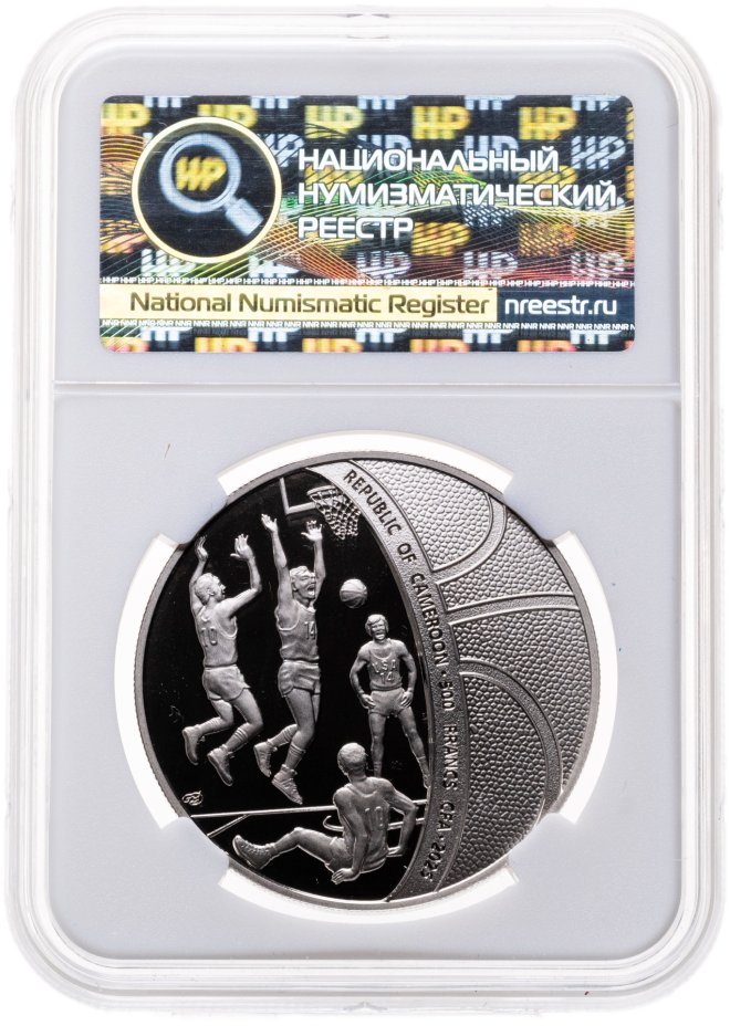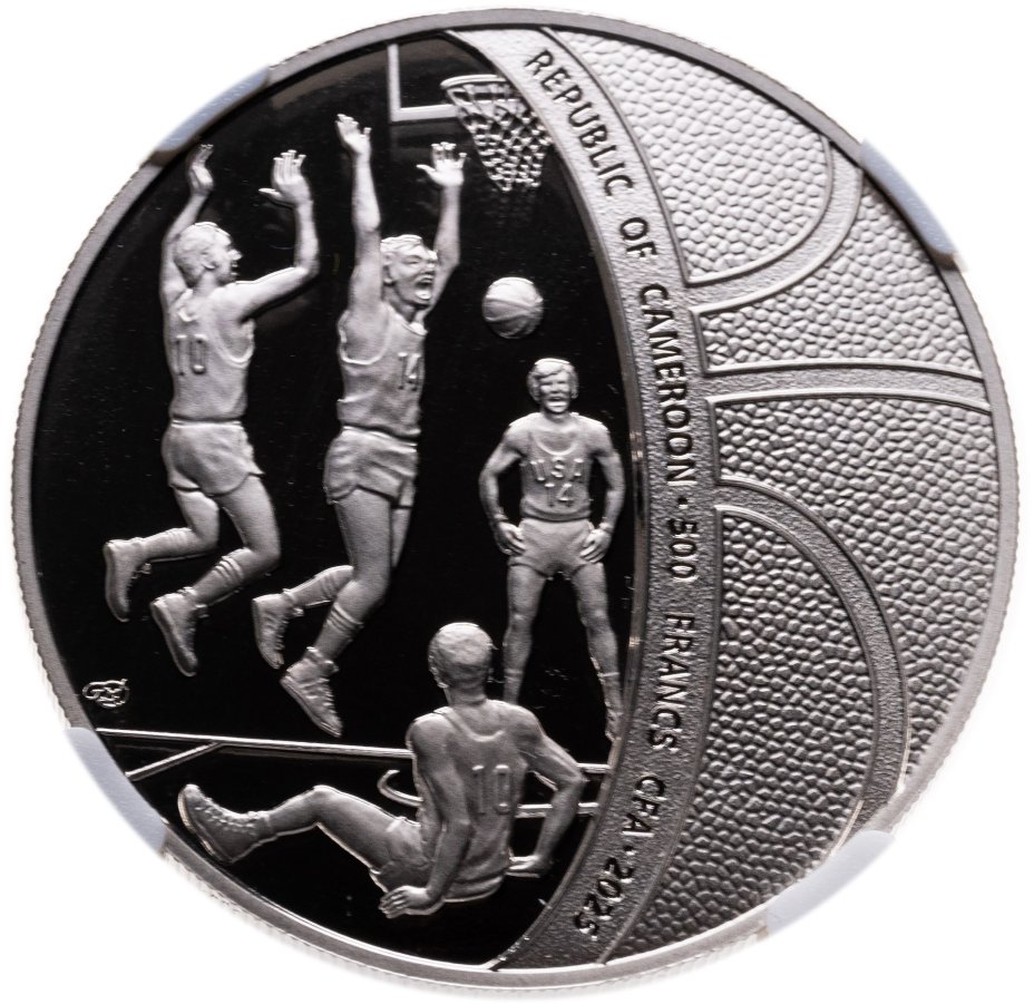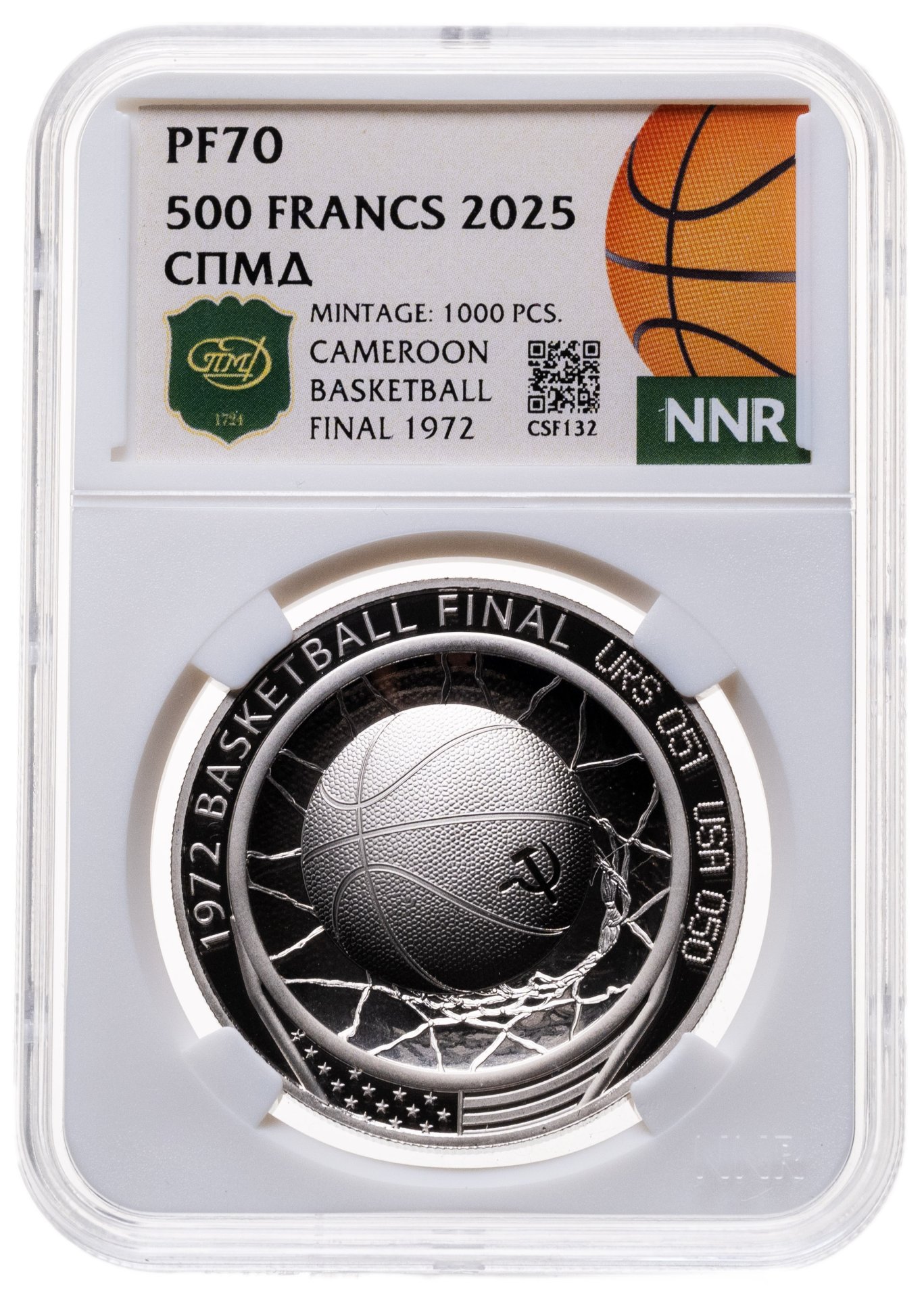 Баскетбол. Спорт. СССР. Финал по баскетболу между сборными СССР и США на Олимпиаде 1972 г. в Мюнхене. 500 франков CFA 2025 СПМД Камерун, в слабе ННР PROOF. Мельхиор, Санкт-Петербургский монетный двор. Тираж: 1,000 шт. Памятная монета отчеканена в серии СПМД «Победы советского спорта» и посвящена знаменитой победе сборной СССР по баскетболу в финале Олимпиады 1972 в Мюнхене над сборной США со счетом 51-50, где решающий победный бросок был в последние 3 секунды матча.
