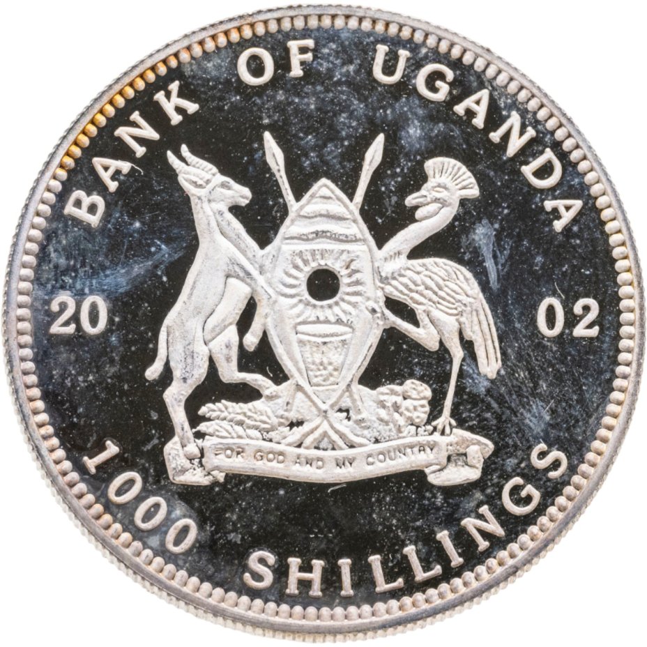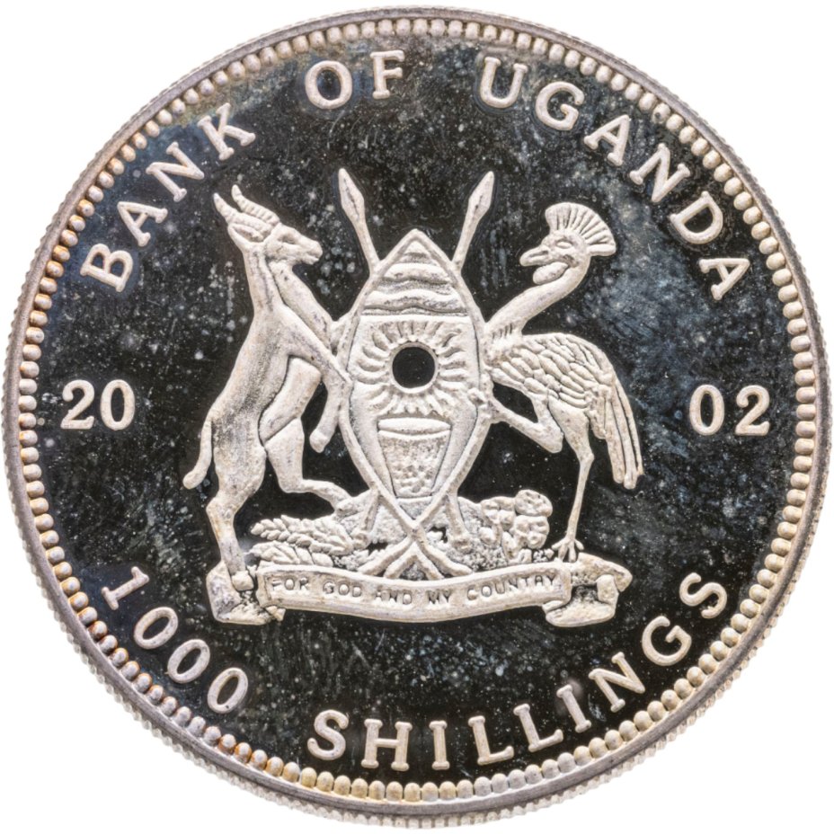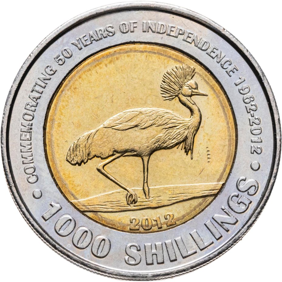 - 1000 - как и на предыдущей монете, здесь изображен венценосный журавль. Изделие отчеканено в честь 50-летия независимости страны из биметалла – латунной вставки и никелево-медного кольца. Имеет гладкий гурт с текстом.