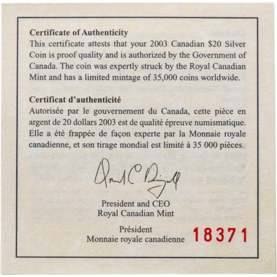 - Тираж: Монетный двор: Оттава, Канада; Proof=15000 шт.