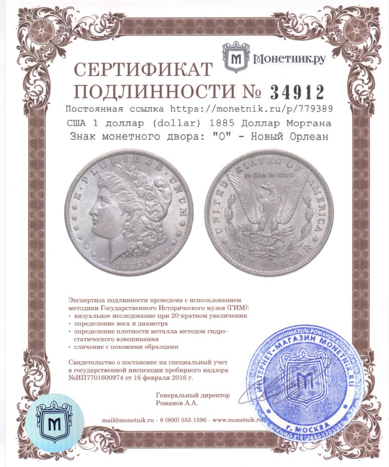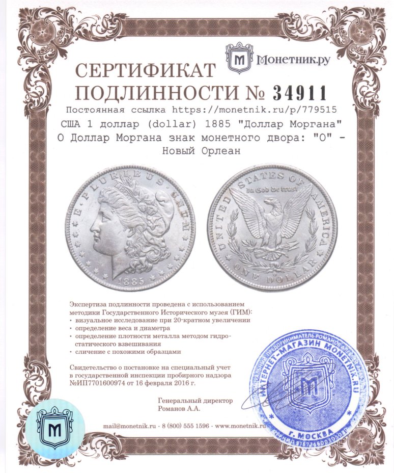 США 1 доллар (dollar) 1885 "Доллар Моргана" O Доллар Моргана знак монетного двора: "O" - Новый Орлеан