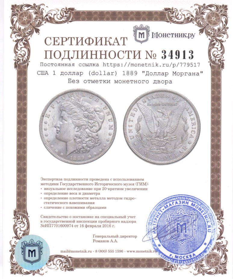 США 1 доллар (dollar) 1889 "Доллар Моргана" Без отметки монетного двора