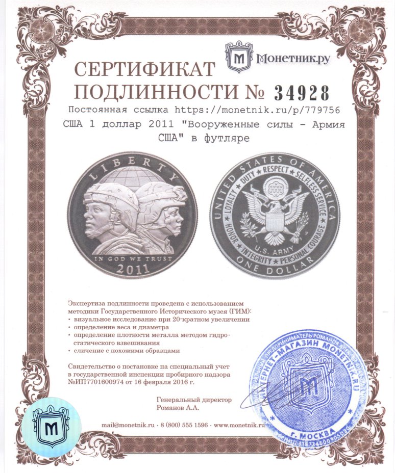 США 1 доллар 2011 "Вооруженные силы - Армия США" в футляре
