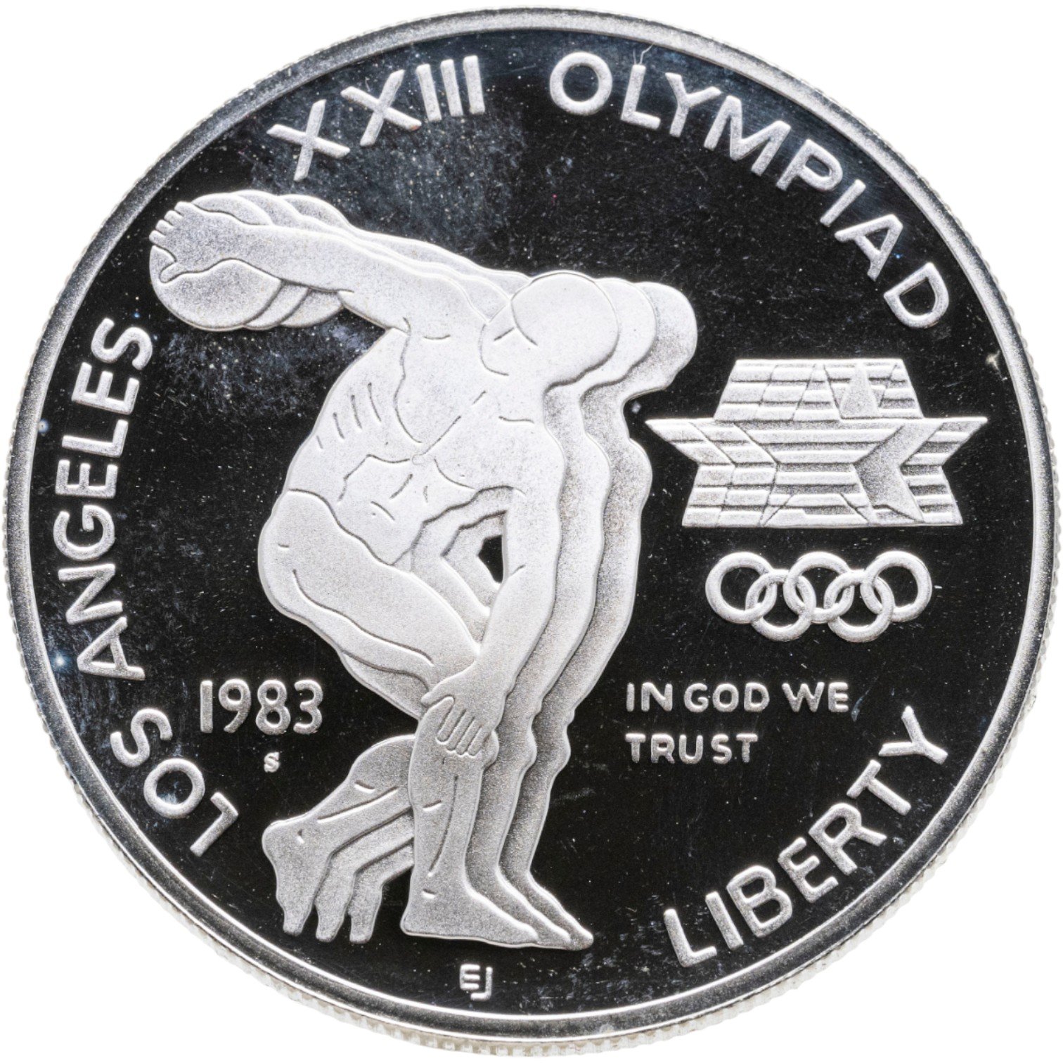 На поле монеты изображен дискобол. Справа олимпийская символика и надпись: "IN GOD WE TRUST". Слева отмечен год выпуска монеты: 1983. Вдоль канта по окружности надписи: "LOS ANGELES", "XXIII OLYMPIAD" и "LIBERTY".