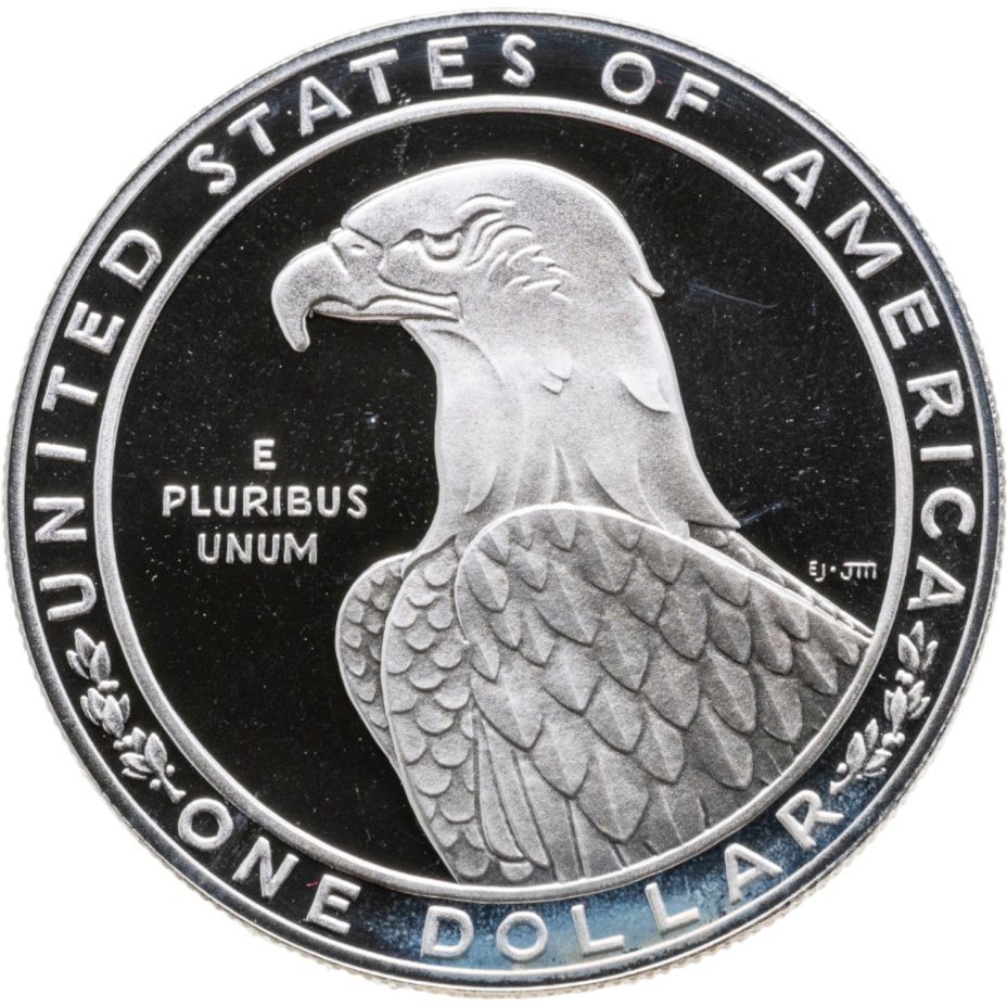 В центре диска изображение американского орла. Слева надпись: "E PLURIBUS UNUM". Вдоль канта по окружности надписи: "UNITED STATES OF AMERICA" и "ONE DOLAR".