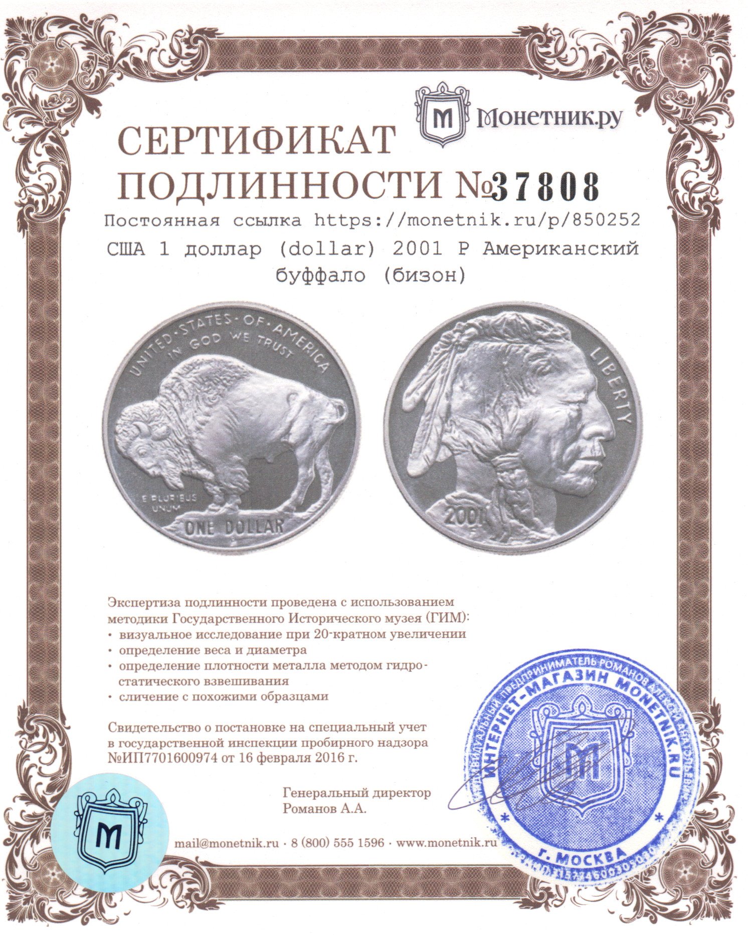• Сертификат подлинности: № 37808