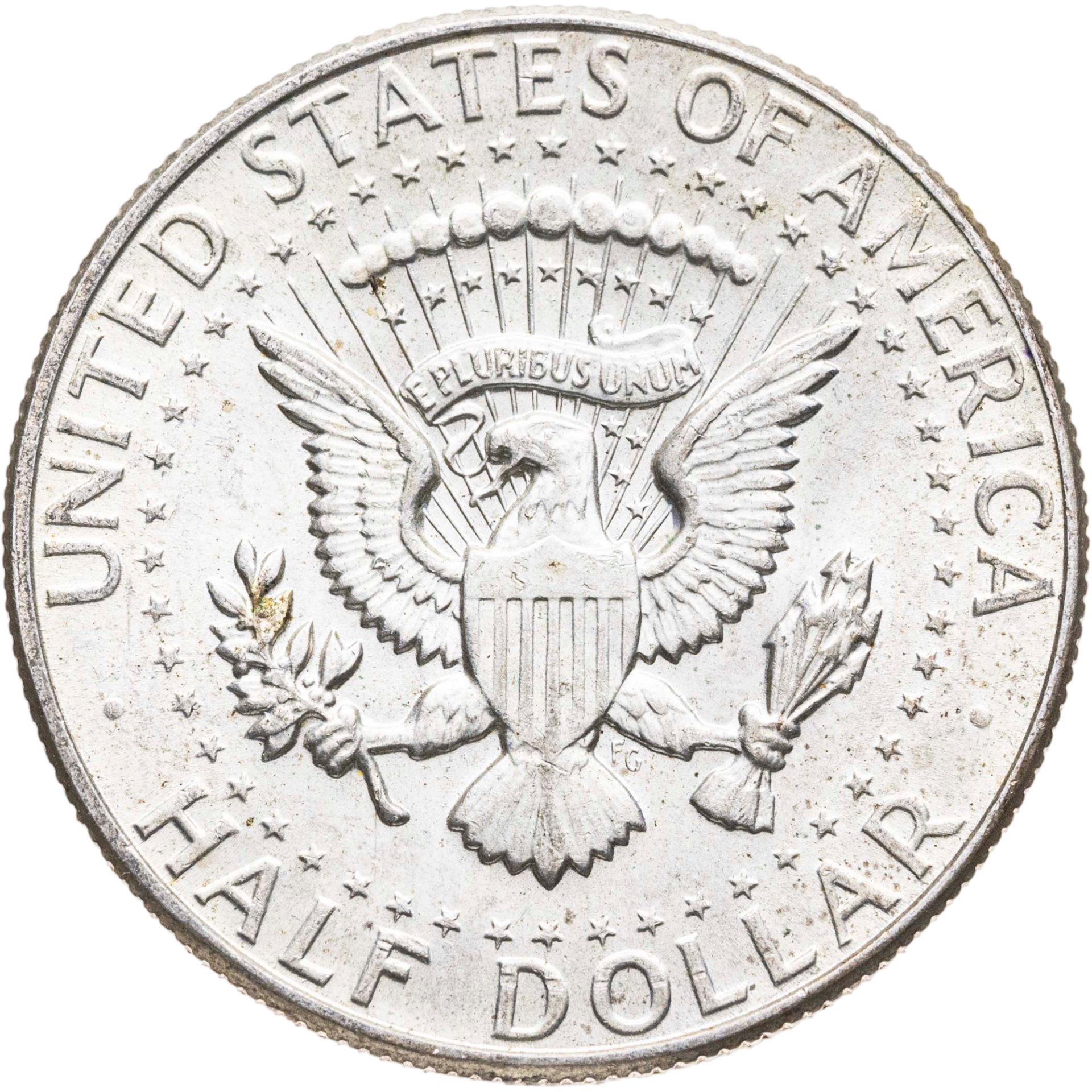 Изображён Государственный герб США (белоголовый орёл со щитом) в кольце из звезд. Надписи: UNITED STATES OF AMERICA / E PLURIBUS UNUM / HALF DOLLAR.