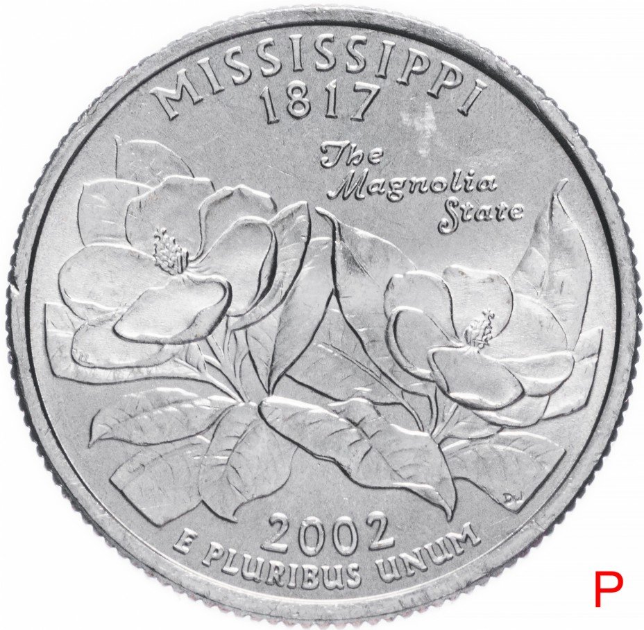 Реверс: В центре изображены два цветка магнолии в окружении листьев. Вверху надпись «MISSISSIPPI 1817», ниже справа надпись «The Magnolia State». Внизу год выпуска 2002 и девиз «E PLURIBUS UNUM» (ИЗ МНОГИХ ЕДИНОЕ).