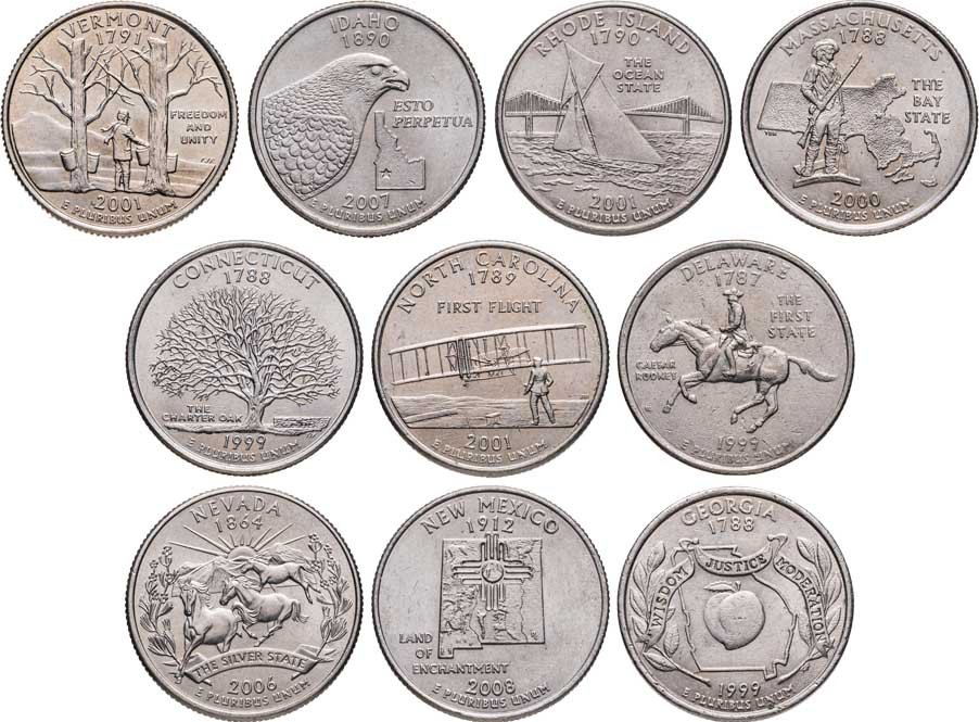 Программа «50 штатов» предусматривала выпуск пяти монет в год, нумизматы, в целом, собирали монеты серии 10 лет. Но это их не огорчало – серия уникальна своим оформлением и интересна с точки зрения познания истории и культуры США. Монетную программу запустили в 1999 г., новый квотер выходил каждые 10 недель. Основой оформления стали особенности и выразительные символы каждой территориальной единицы США.