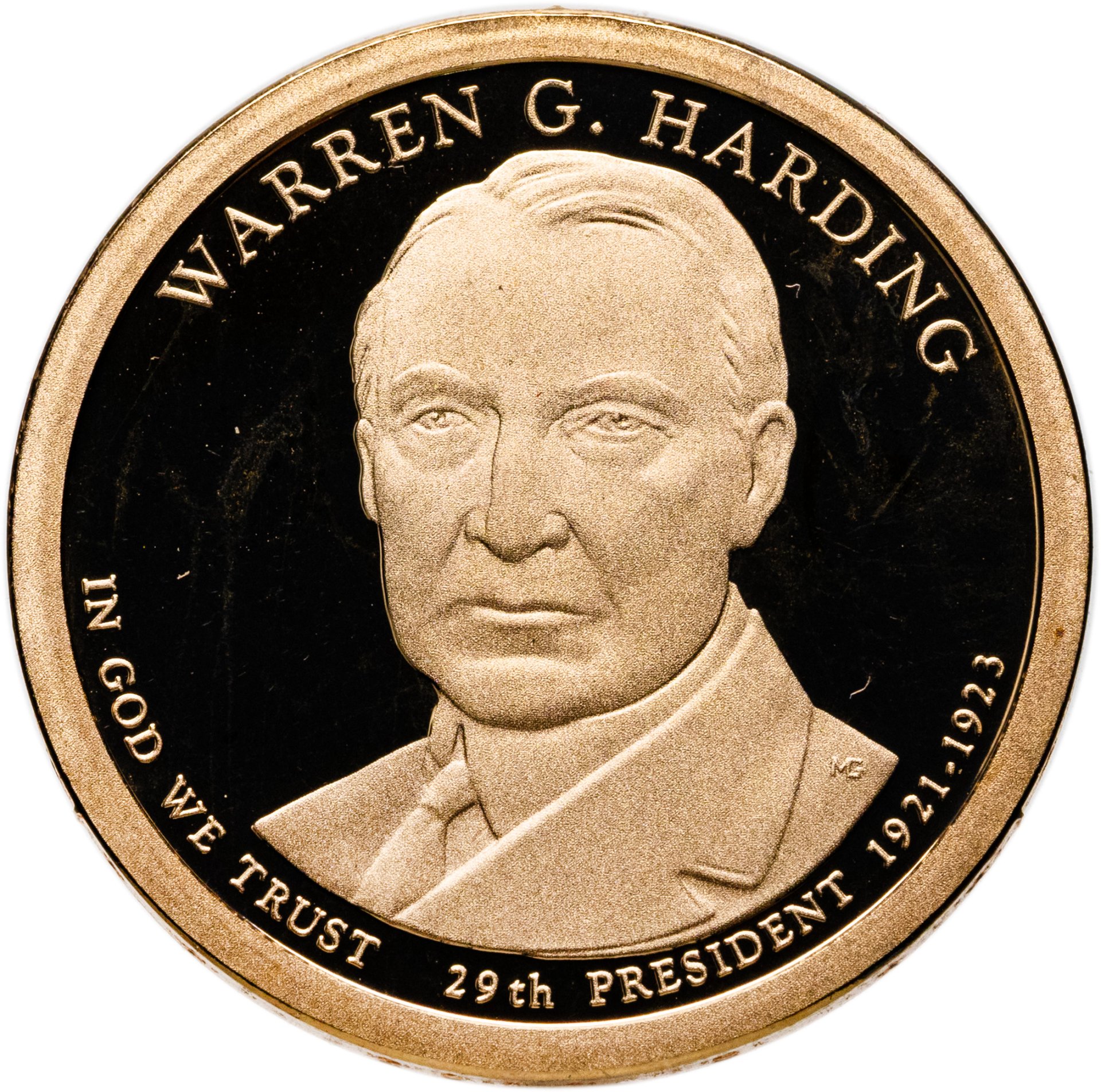 Аверс: Сверху вдоль канта надпись «WARREN G.HARDING» внизу «IN GOD WE TRUST / 29TH PRESIDENT 1921-1923». В центре портрет Уоррена Гардинга. Реверс: Надпись по кругу «UNITED STATES OF AMERICA». Изображение статуи Свободы смещено вправо, слева знак “$1”. На книге, которую держит в руках Свобода, видна монограмма монетного двора Денвера (DE).
