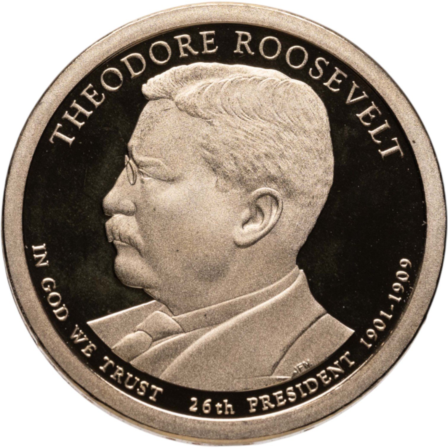 На аверсе монеты – портрет (в профиль) Теодора Рузвельта. Над изображением, под кантом монеты расположена надпись: «THEODORE ROOSEVELT», в нижней части над кантом в одну строку надписи: слева – девиз «IN GOD WE TRUST», в центре – «порядковый номер» «26th PRESIDENT», справа – годы его нахождения в должности Президента «1901-1909».