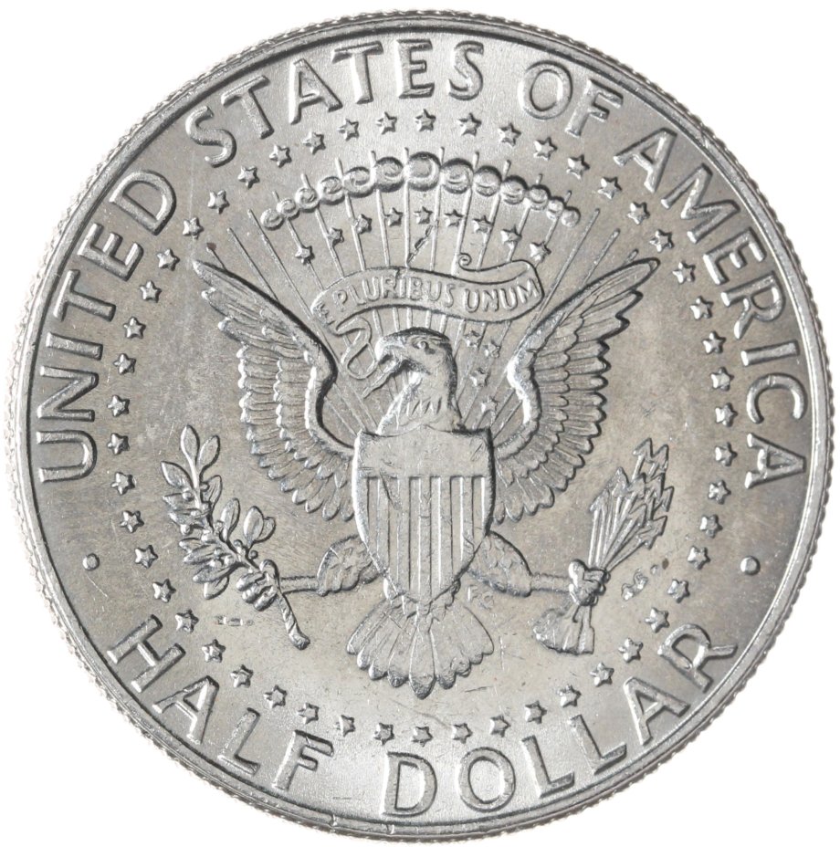 Разменная монета в полдоллара - Half dollar (50 центов) с изображением Джона Кеннеди также меняла только сплав: с 1964 по 1970 год количество серебра уменьшалось с 90 до 40%, а с 1971 года монета чеканится в медно-никелевом сплаве.