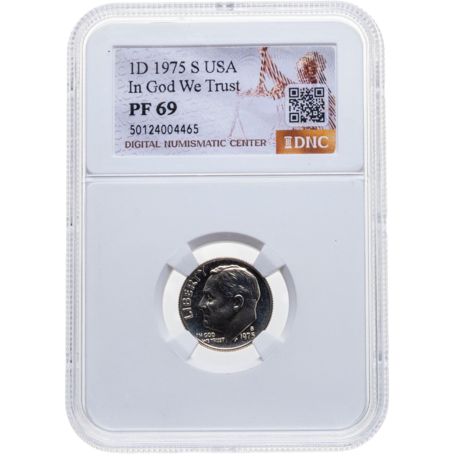 Сертификат подлинности США 1 дайм (10 центов, one dime) 1975 S "Roosevelt Dime" в слабе DNC PF69