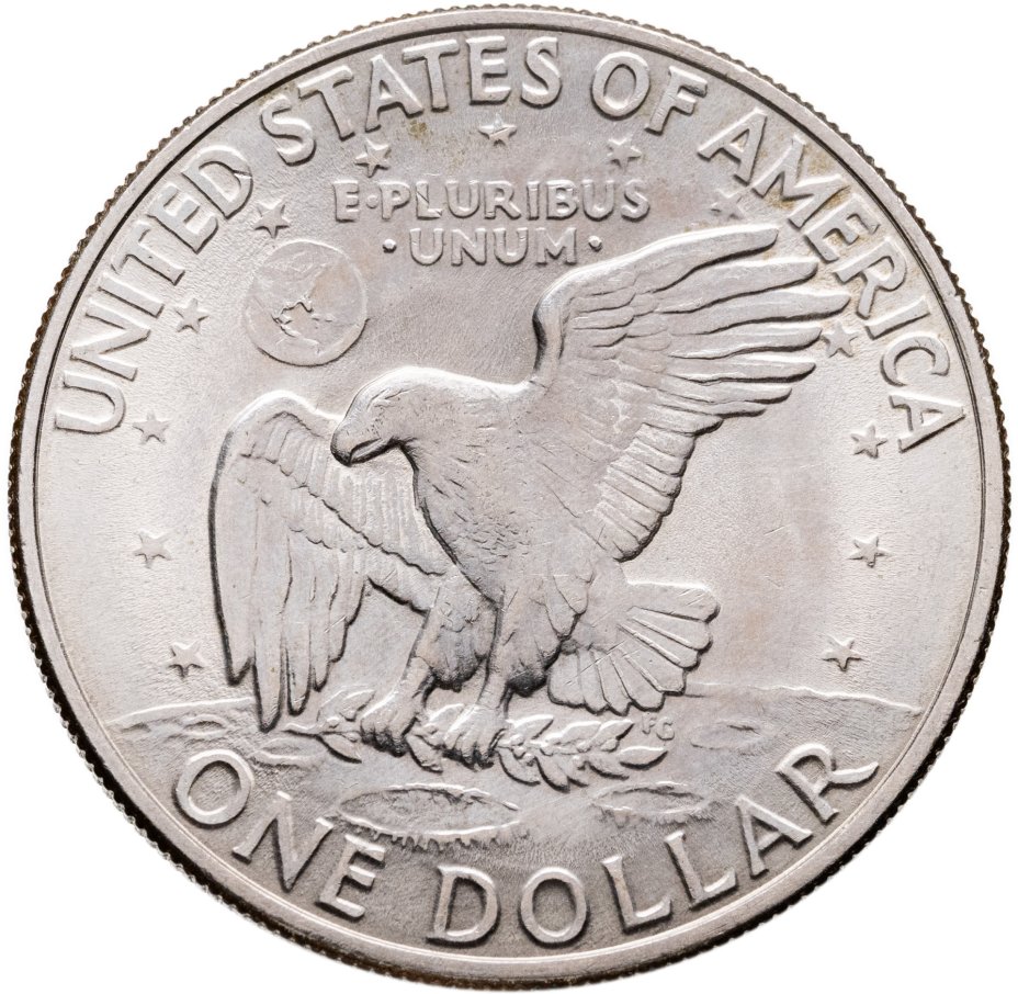 Орёл над поверхностью Луны - символизирует высадку американцев на Луне. Легенда: UNITED STATES OF AMERICA / E PLURIBUS UNUM / ONE DOLLAR.