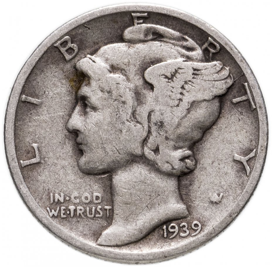 Купить США 10 центов (дайм, one dime) 1939 Mercury Dime Без отметки монетного двора