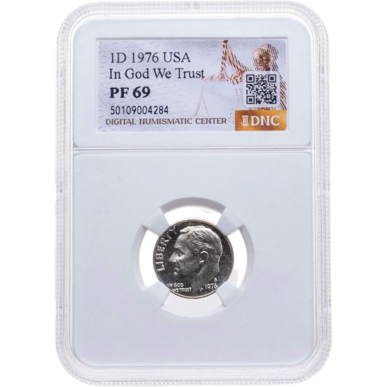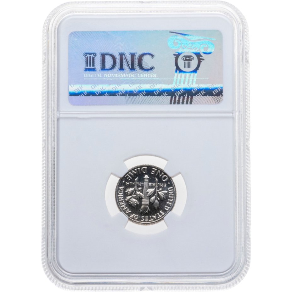 Сертификат подлинности США 10 центов (one dime) 1976 "Roosevelt Dime" в слабе DNC PF69