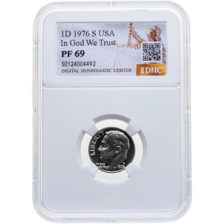 Сертификат подлинности США 10 центов (one dime) 1976 S "Roosevelt Dime" в слабе DNC PF69