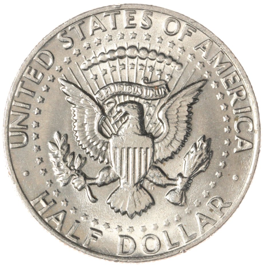 Изображён Государственный герб США (белоголовый орёл со щитом) в кольце из звезд. Надписи: UNITED STATES OF AMERICA / E PLURIBUS UNUM / HALF DOLLAR.