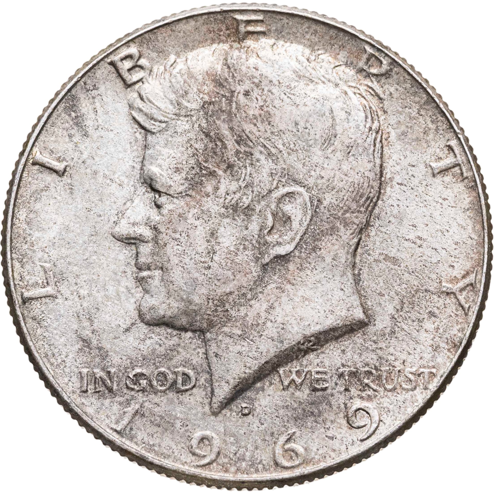 Изображён портрет Джона Кеннеди, 35-го президента США, вправо. Надписи: LIBERTY / IN GOD WE TRUST / 1969.