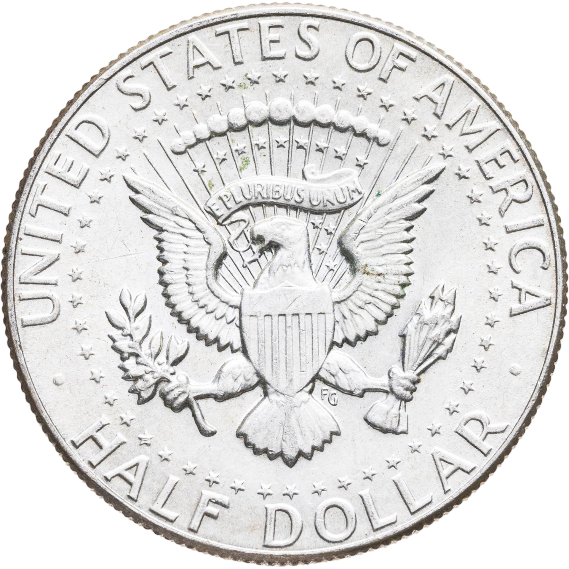 Изображён Государственный герб США (белоголовый орёл со щитом) в кольце из звезд. Надписи: UNITED STATES OF AMERICA / E PLURIBUS UNUM / HALF DOLLAR.