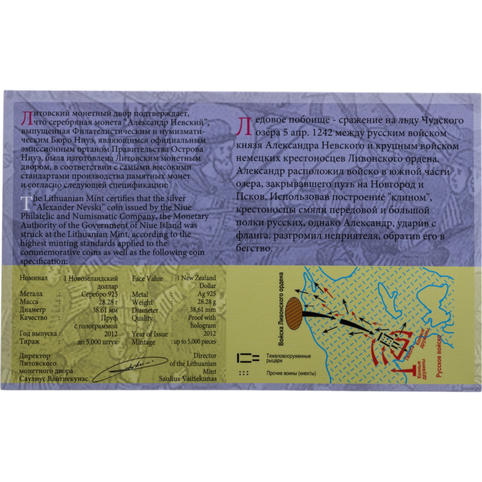 Ниуэ 1 доллар 2012 "Ледовое побоище - Александр Невский" в буклете