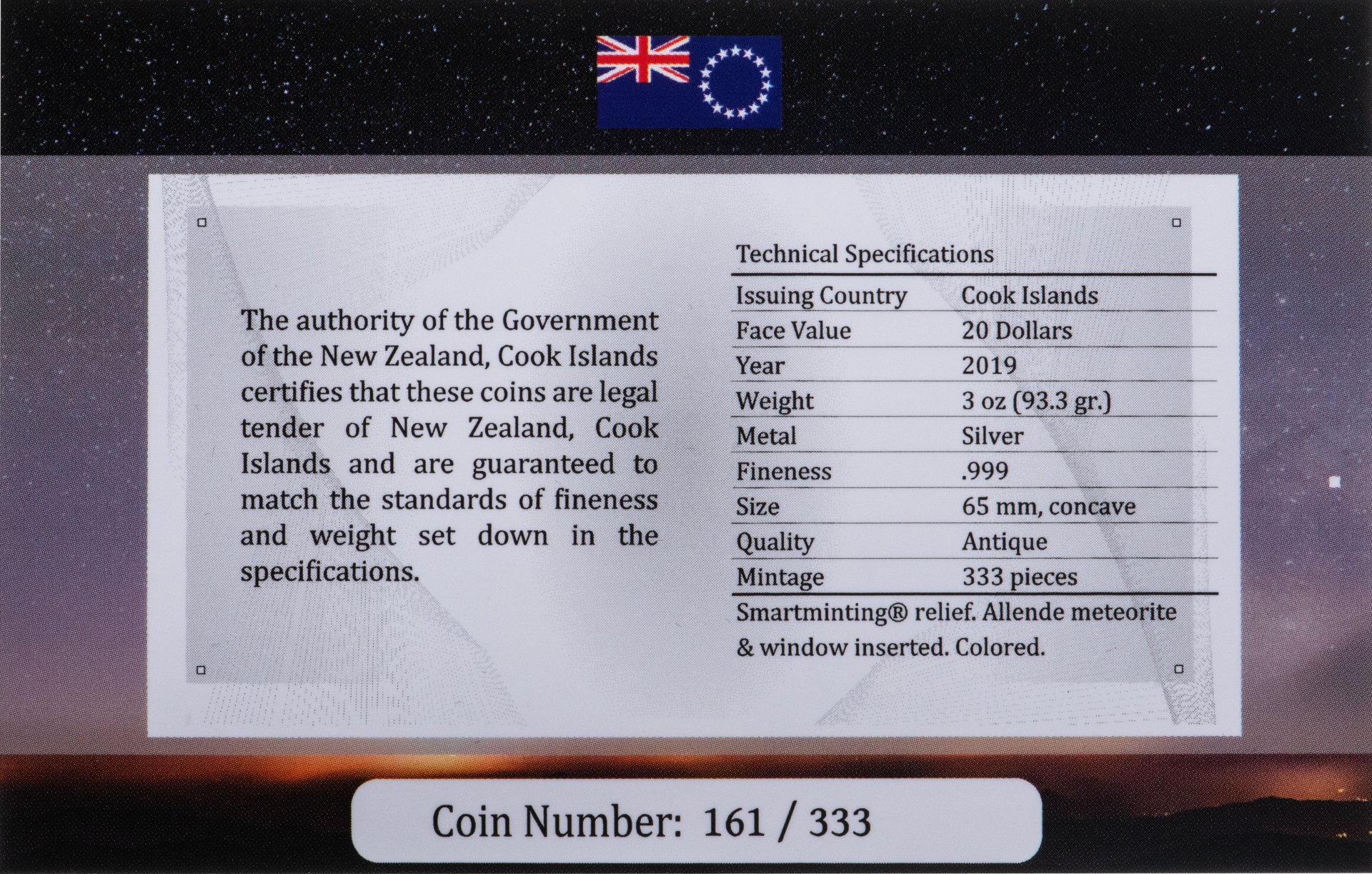 Купить Острова Кука 20 долларов 2019 "Метеорит Чиксулуб Динозавр", в футляре с сертификатом
