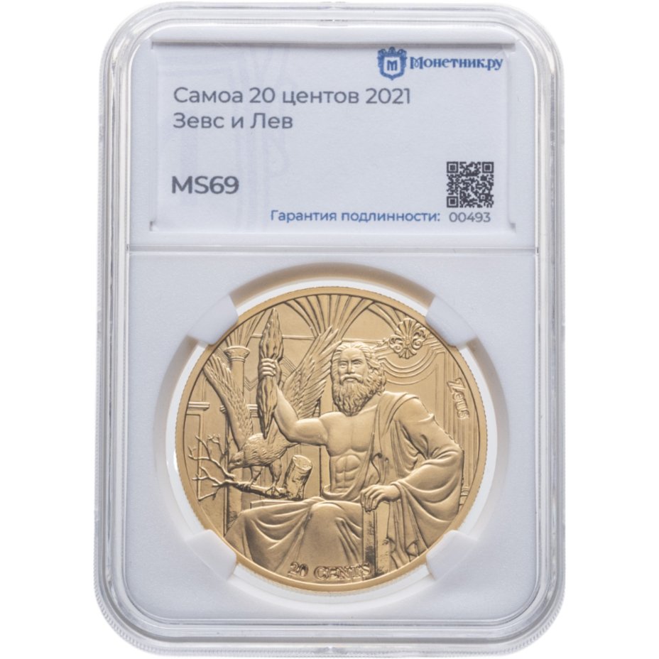 Самоа 20 центов (cents) 2021 "12 Олимпийских богов в зодиаке - Зевс и Лев" в слабе Монетник.ру MS69