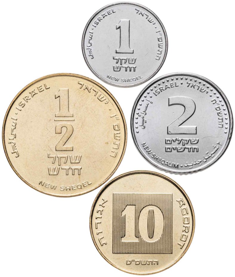 Номиналы 10 агорот; 1/2, 1 и 2 шекелей