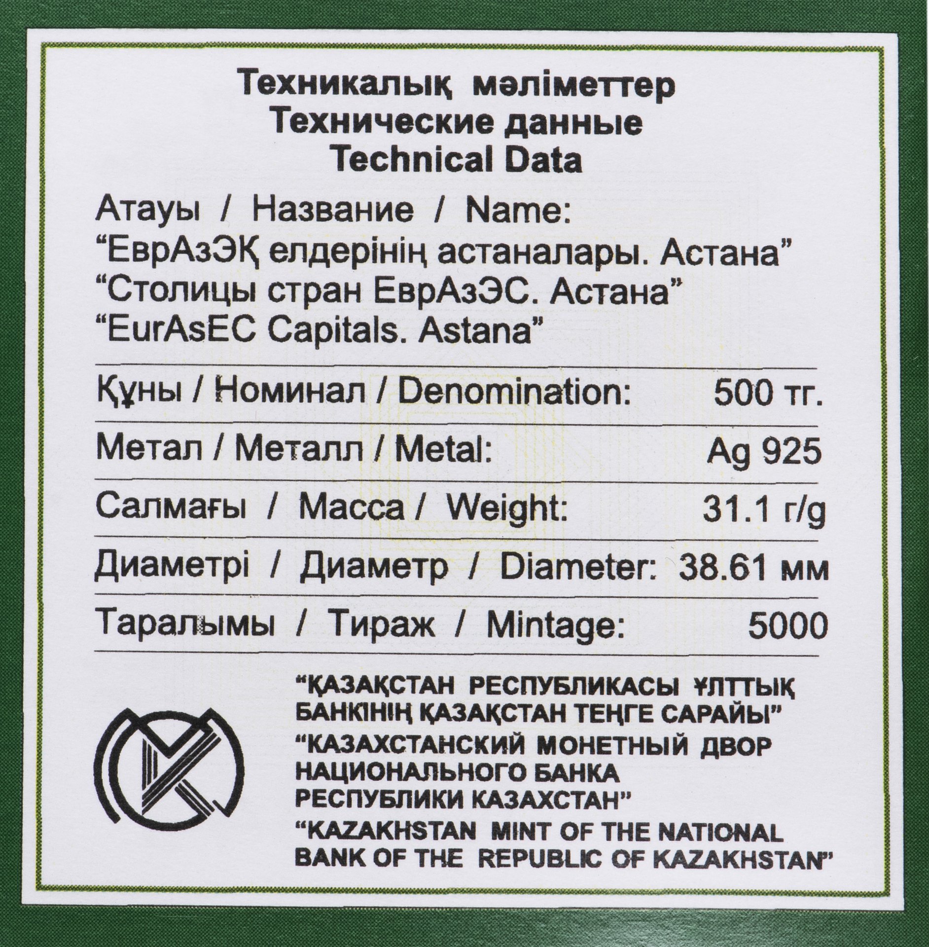 • Тираж (шт): Монетный двор: Усть-Каменогорск, Казахстан; Знак: ҚҰБ; Proof=5000
