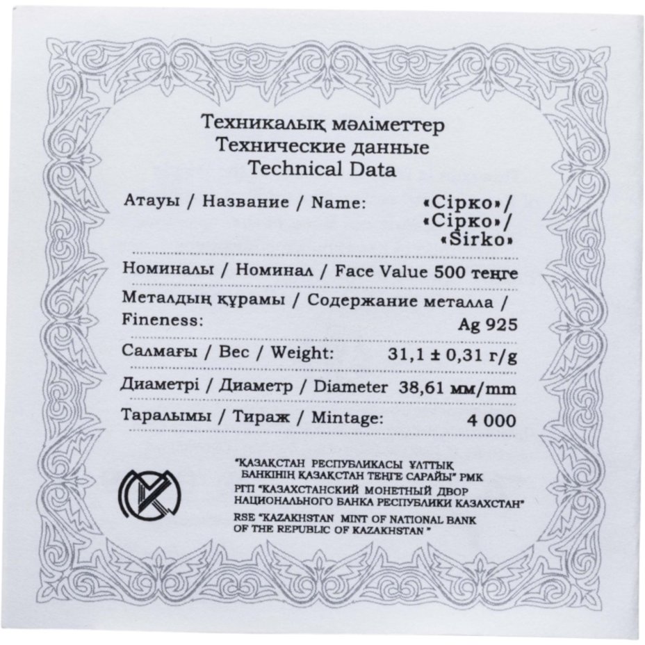 - Тираж: Монетный двор: Усть-Каменогорск, Казахстан; Знак: ҚҰБ; Proof=4000 шт.
