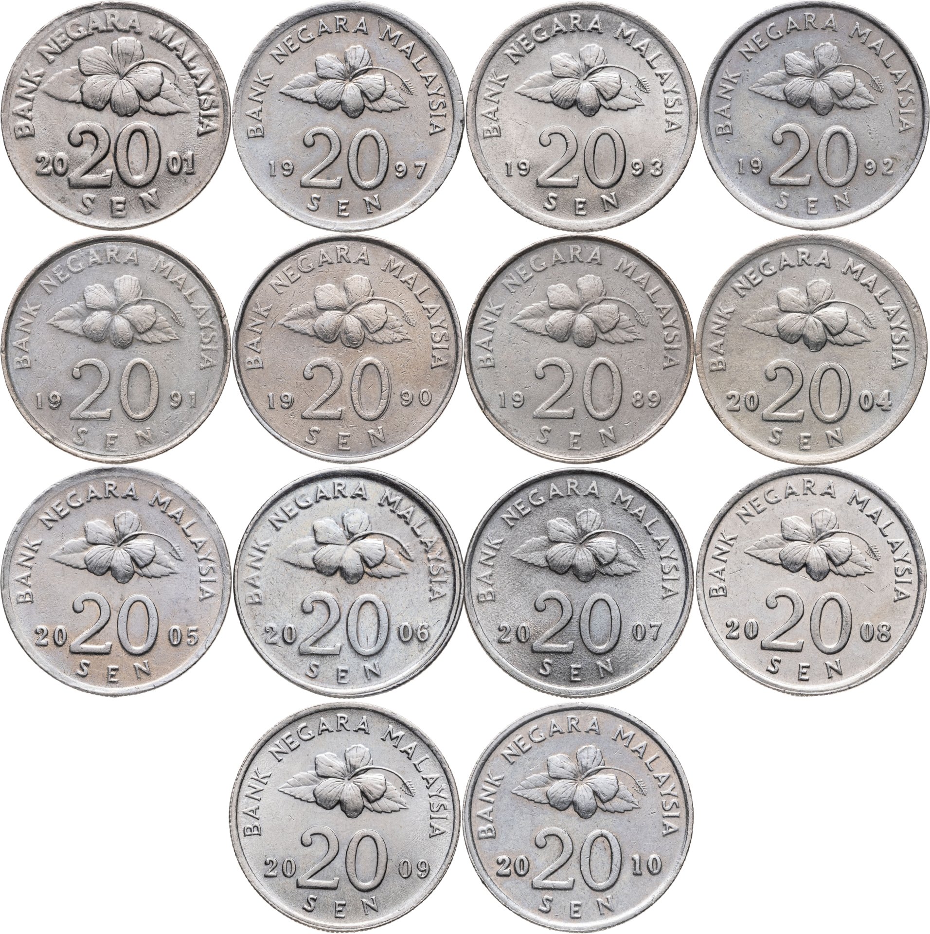 Малайзия набор монет 20 сенов (sen) 1989-2010 (14 штук)