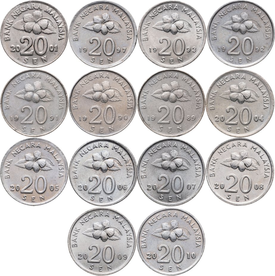 Купить Малайзия набор монет 20 сенов (sen) 1989-2010 (14 штук)