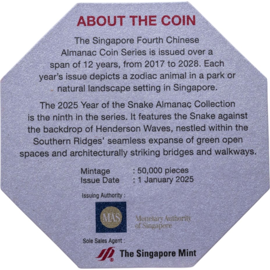 - Тираж: Монетный двор: Сингапур, Сингапур; UNC=да; BU=55000 шт.